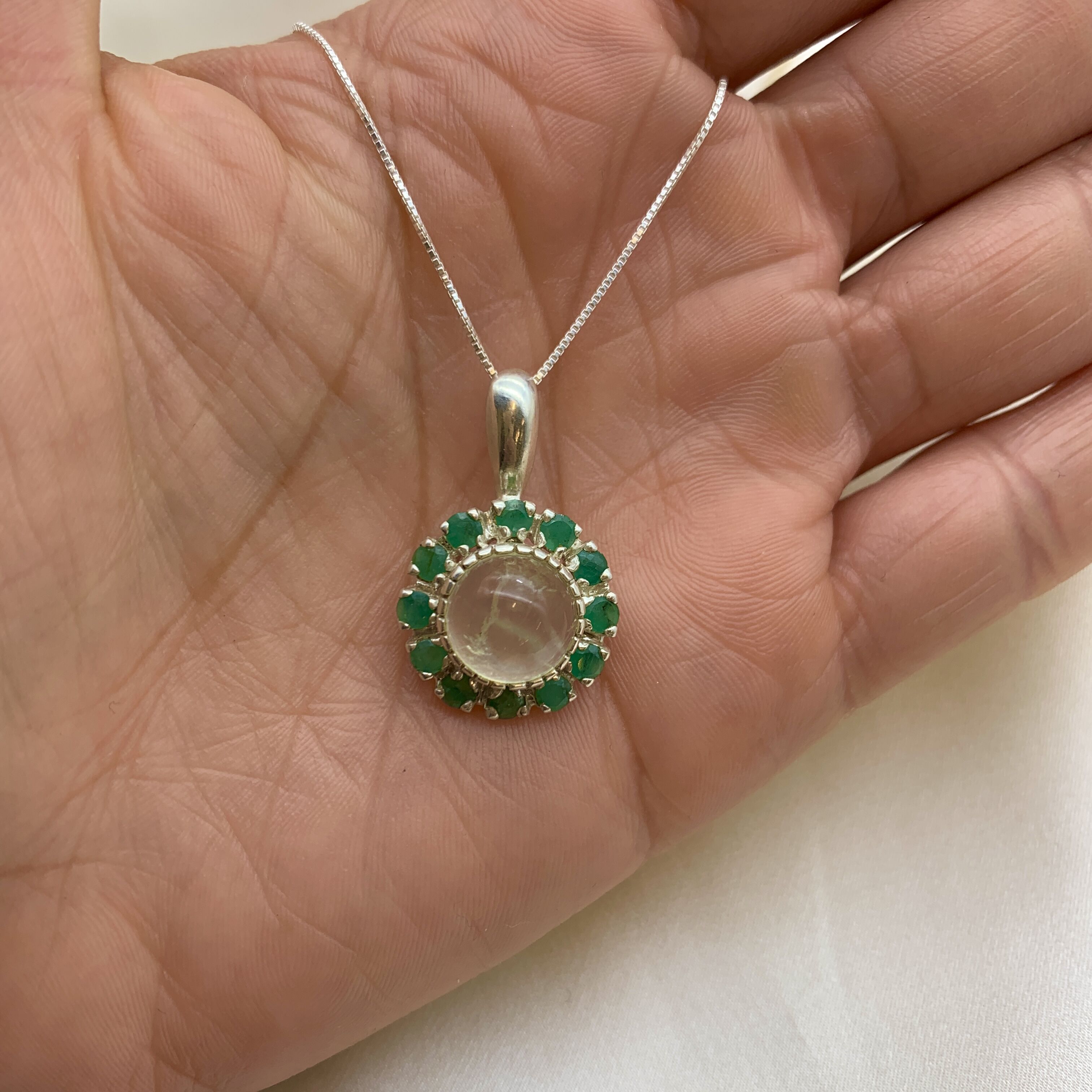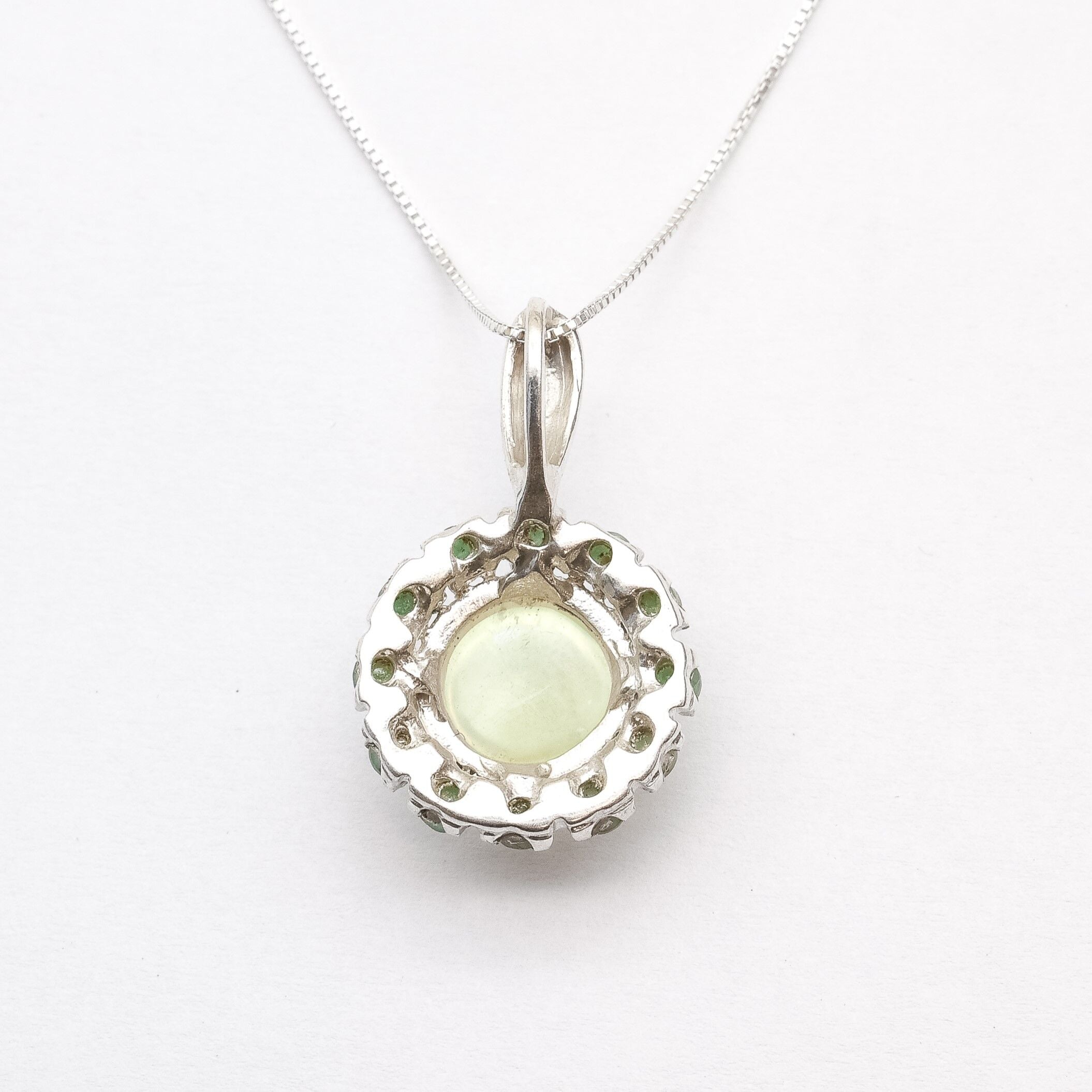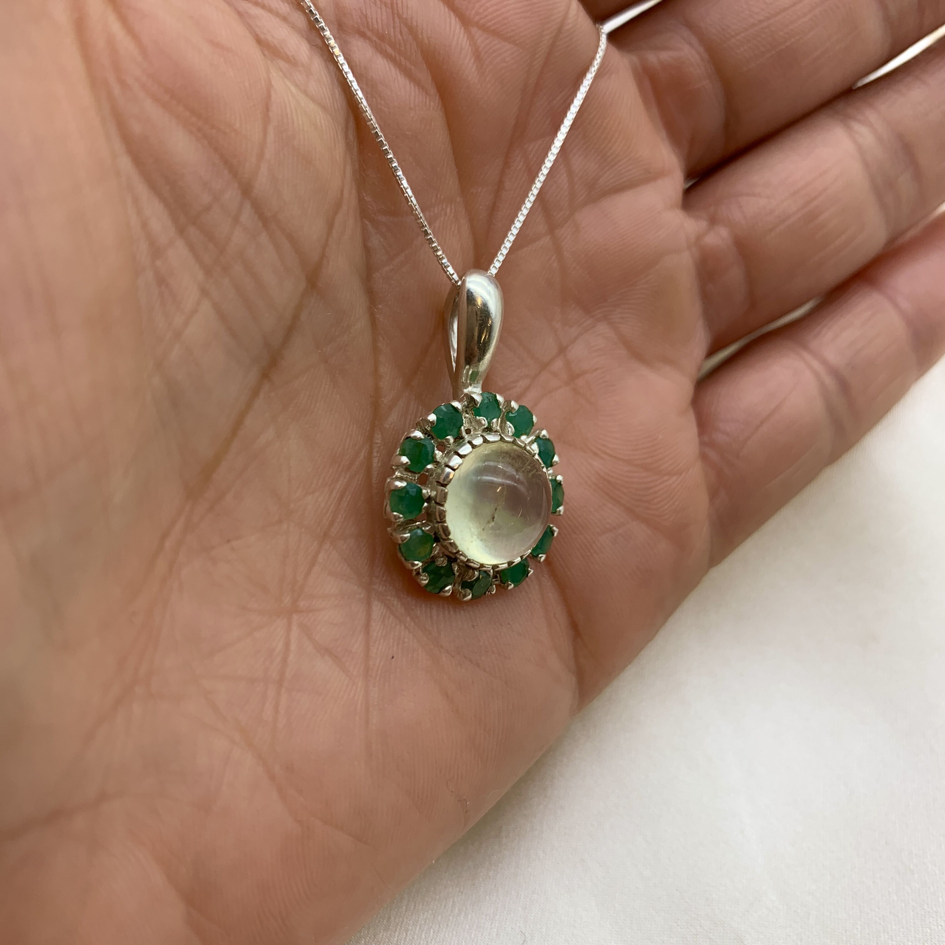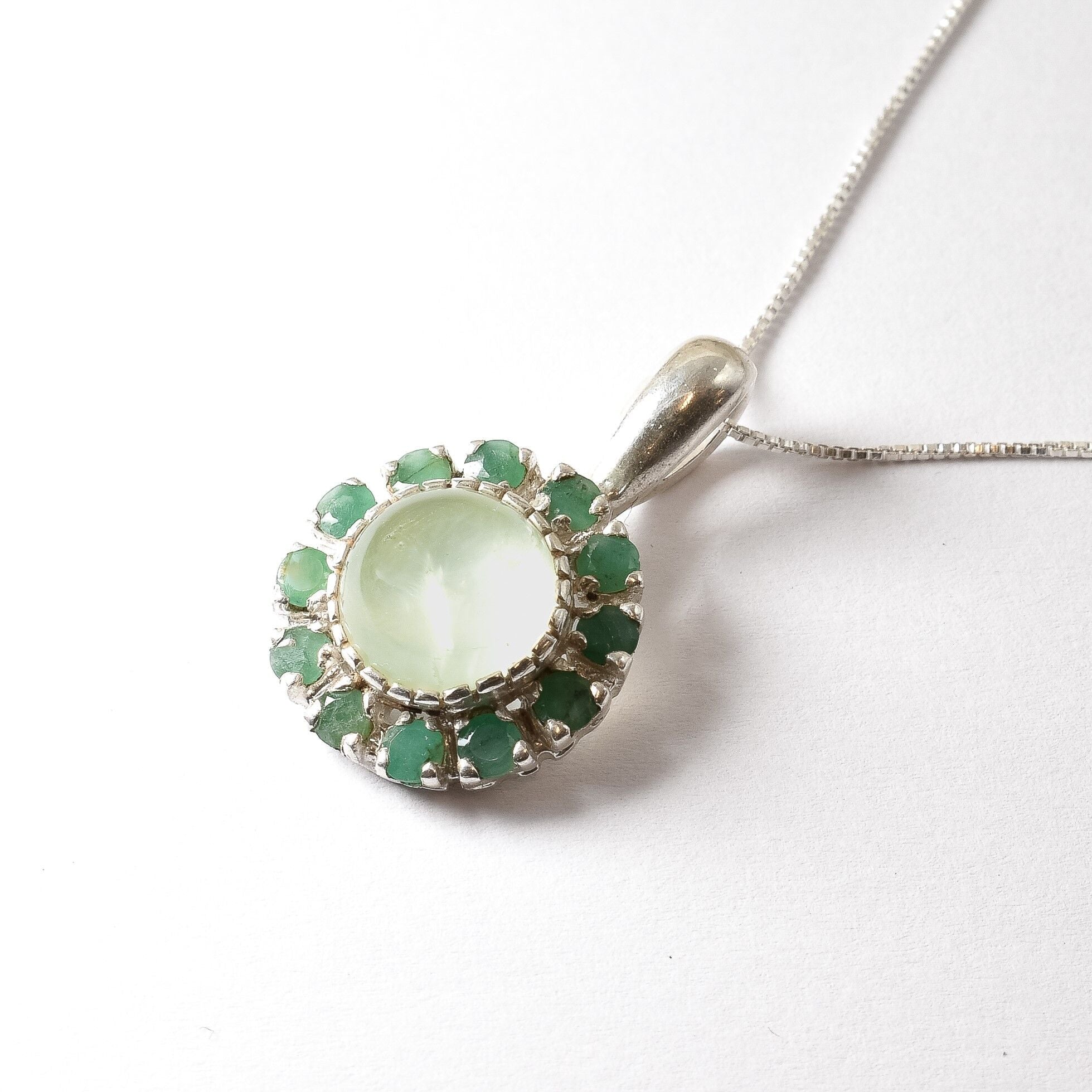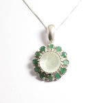 Victorian Flower Pendant set with Natural Prehnite in a stunning green color with natural inclusions, at 10mm diameter (4 Cts) from South Africa surrounded with Natural Emerald at 3mm (2 Cts).