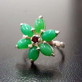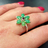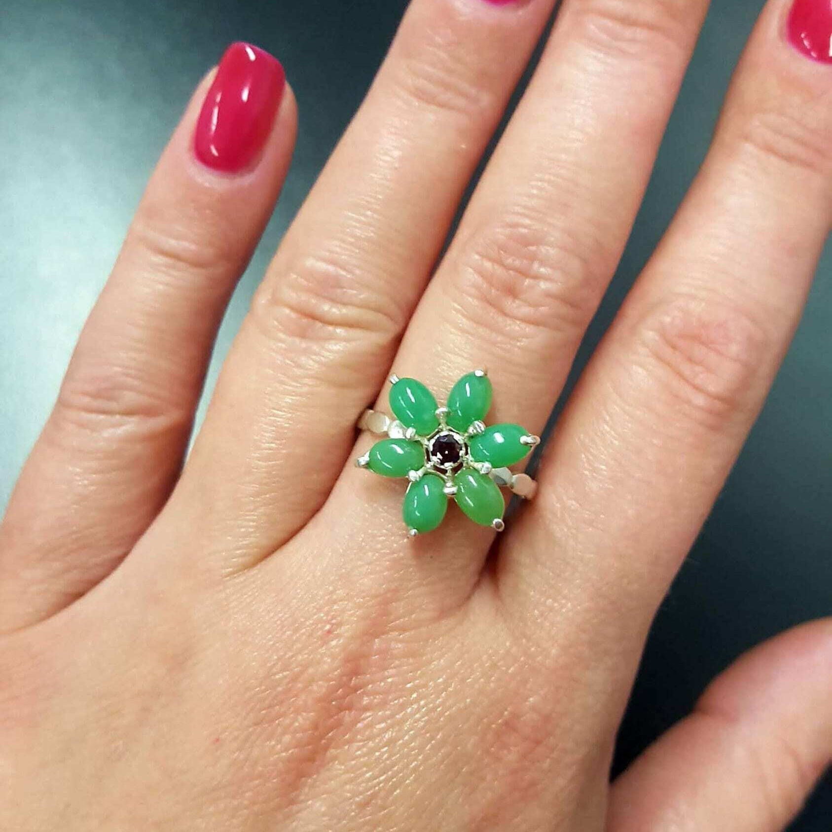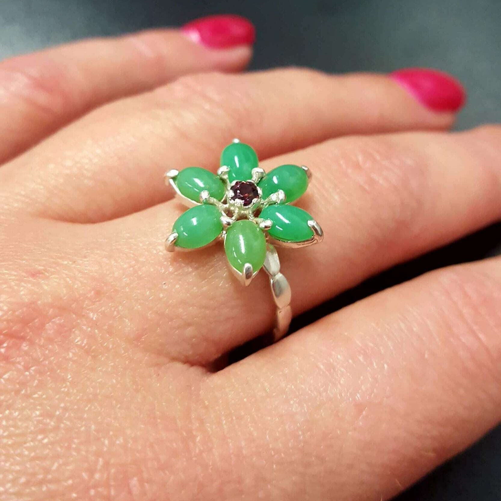 Flower Ring, Natural Chrysoprase, Bright Ring, Natural Garnet, Floral Ring, Green Ring, Big Flower Ring, Green Daisy, Solid Silver Ring