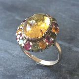Flower Tourmaline Ring set with Natural Yellow Tourmaline at 14x10mm (6 Cts) and small Tourmalines in all its colors - Pink, Green, Yellow & Orange in a perfect diamond cut & flawless color at 3mm each (2 Cts) from Zambia.