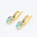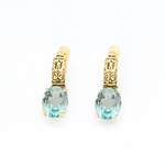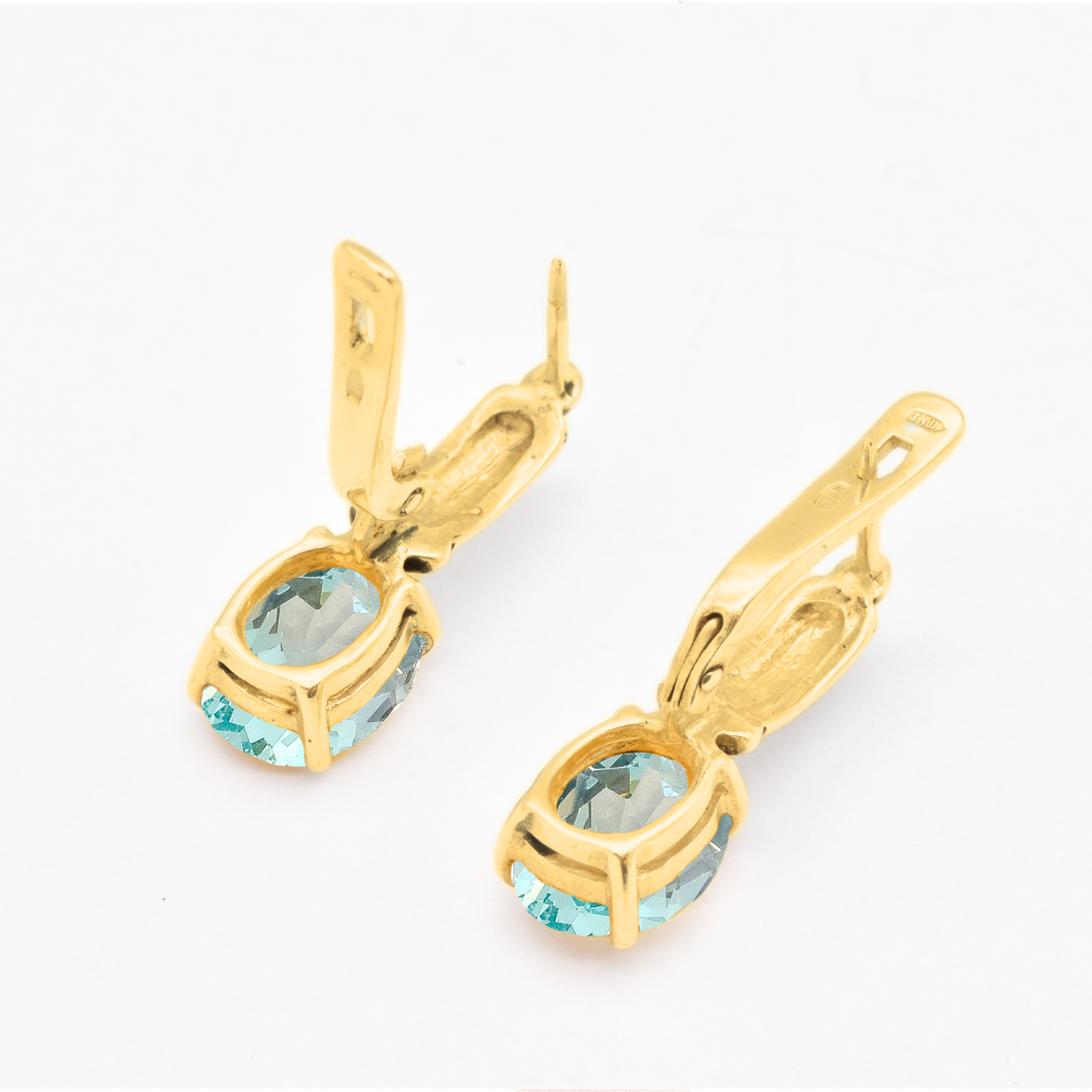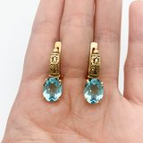 Gold Aqua Earrings set with a Created Aquamarine in a perfect diamond cut, flawless clarity & stunning aqua color at 10x8mm each (6 Ct a pair)