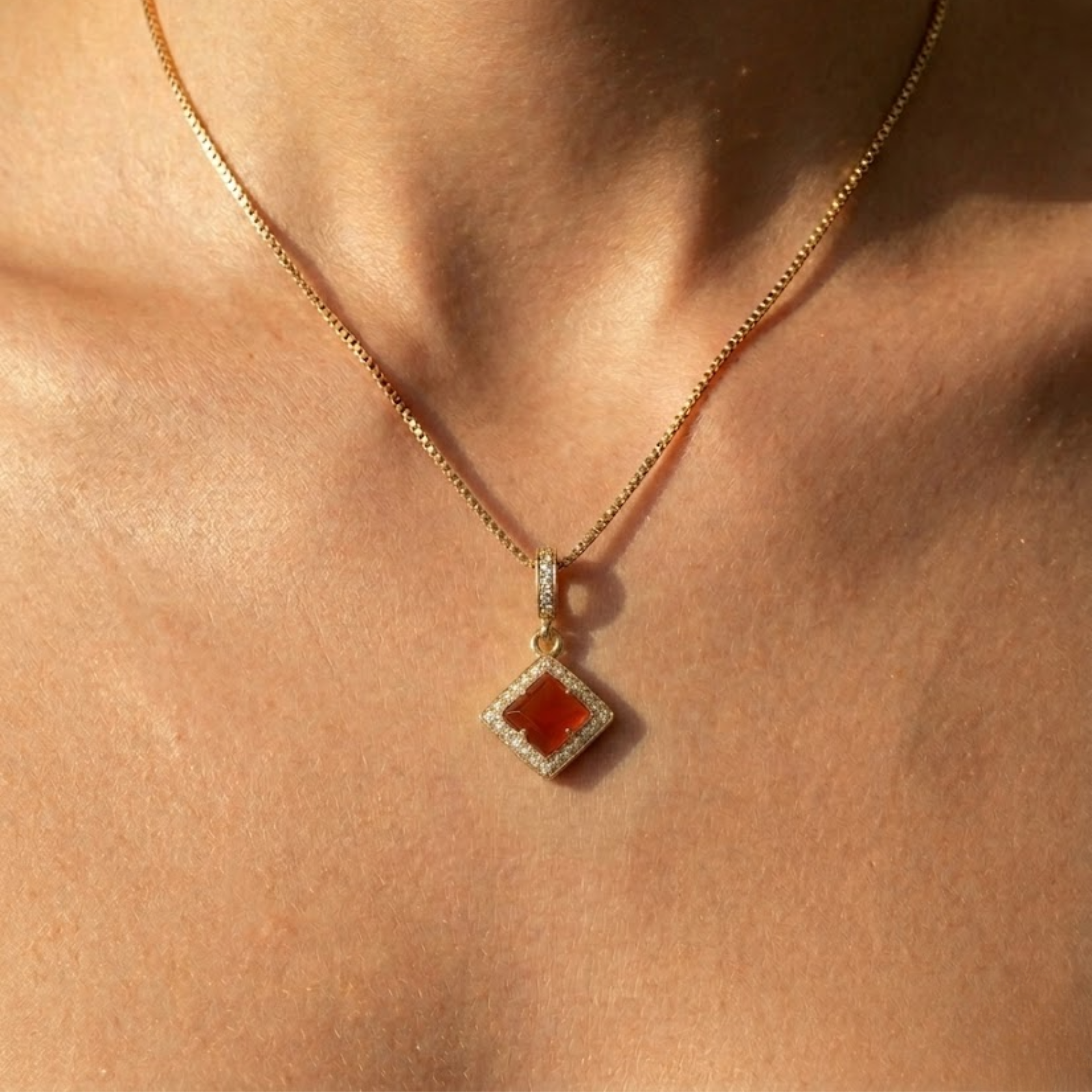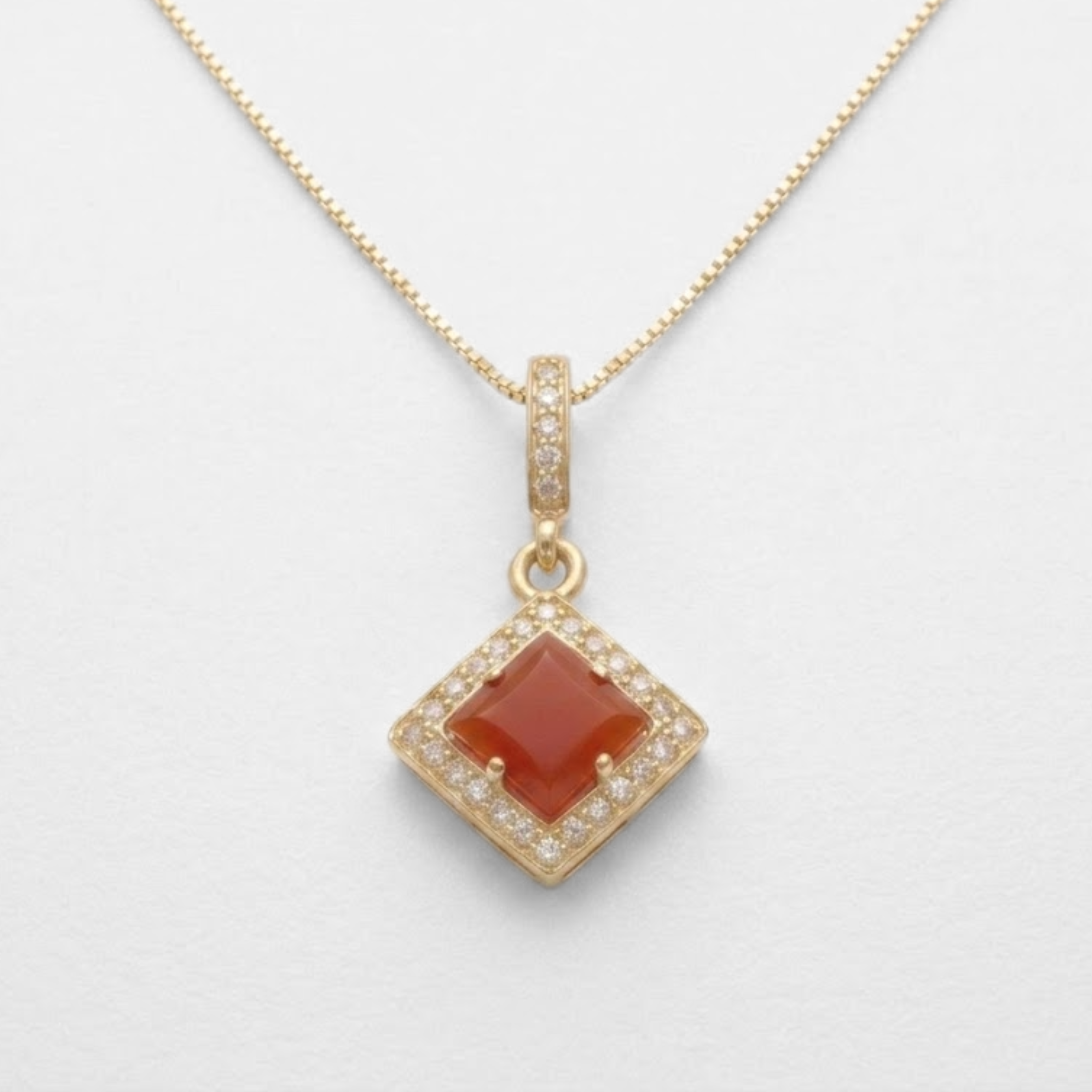 Gold Carnelian Pendant set with a Natural Carnelian in a top grade & vibrant red color, at 8x8mm size (3 Cts) from Uruguay. With small CZ Diamond around.