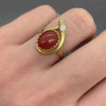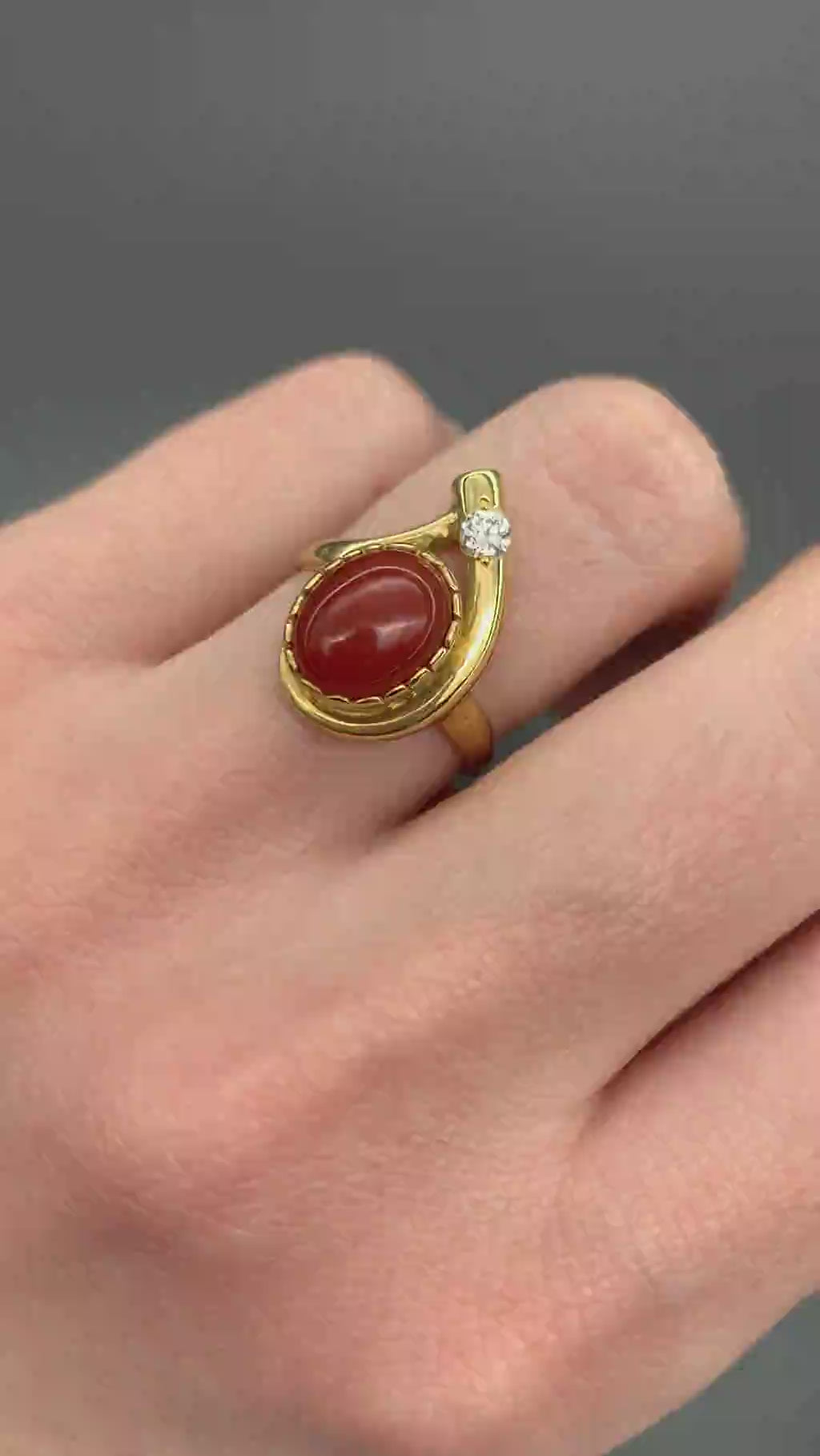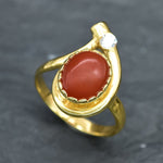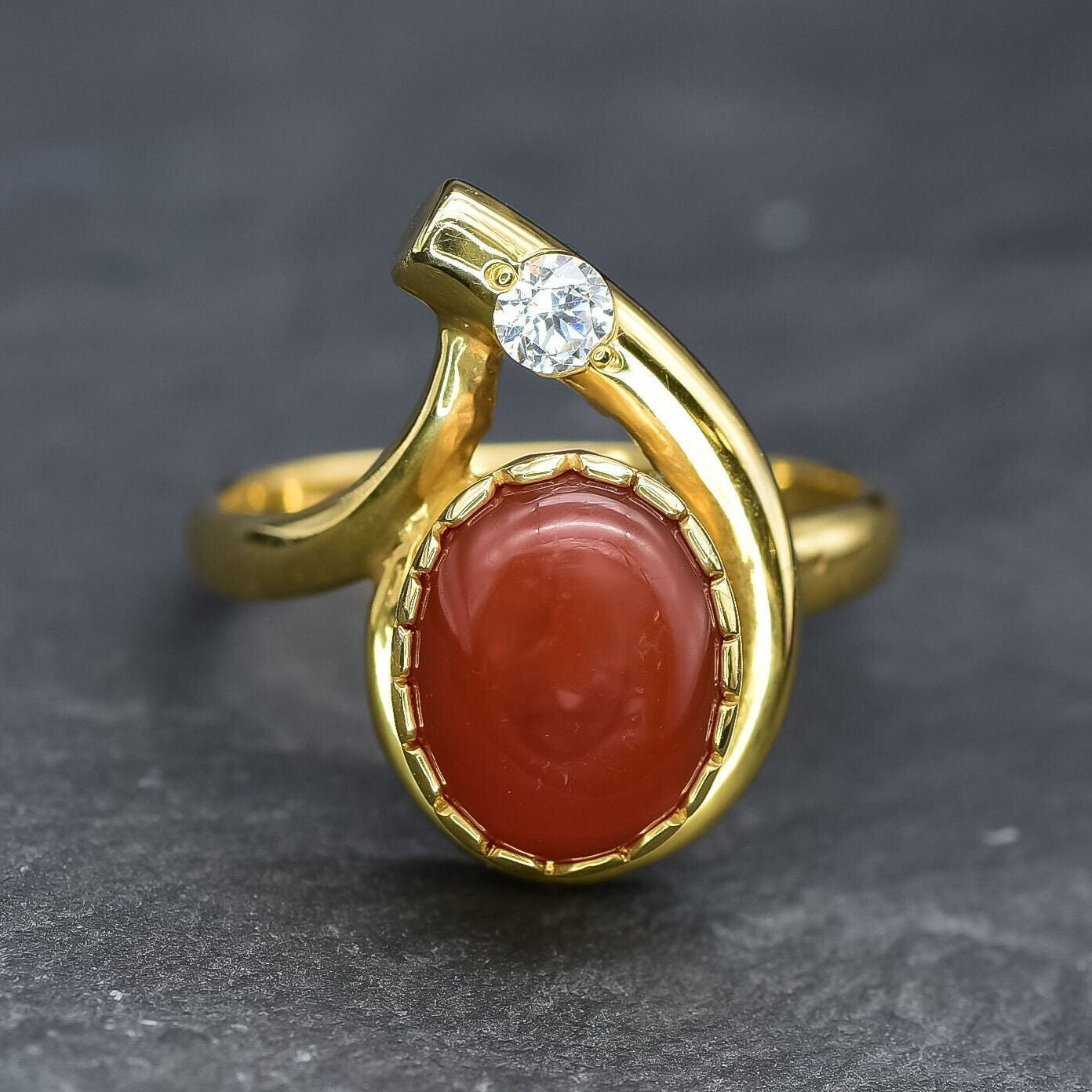 Gold Carnelian Ring with a Natural Carnelian (Red Agate) stone in the stunning smooth red color, at 10x8mm (3 Cts) from Uruguay & a small CZ Diamond at 3mm.