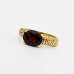 Gold Garnet Ring set with Natural Garnet in a diamond cut & natural deep red color, at size 10x8mm (3 Cts) from Mozambique.