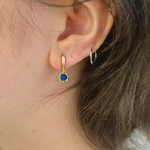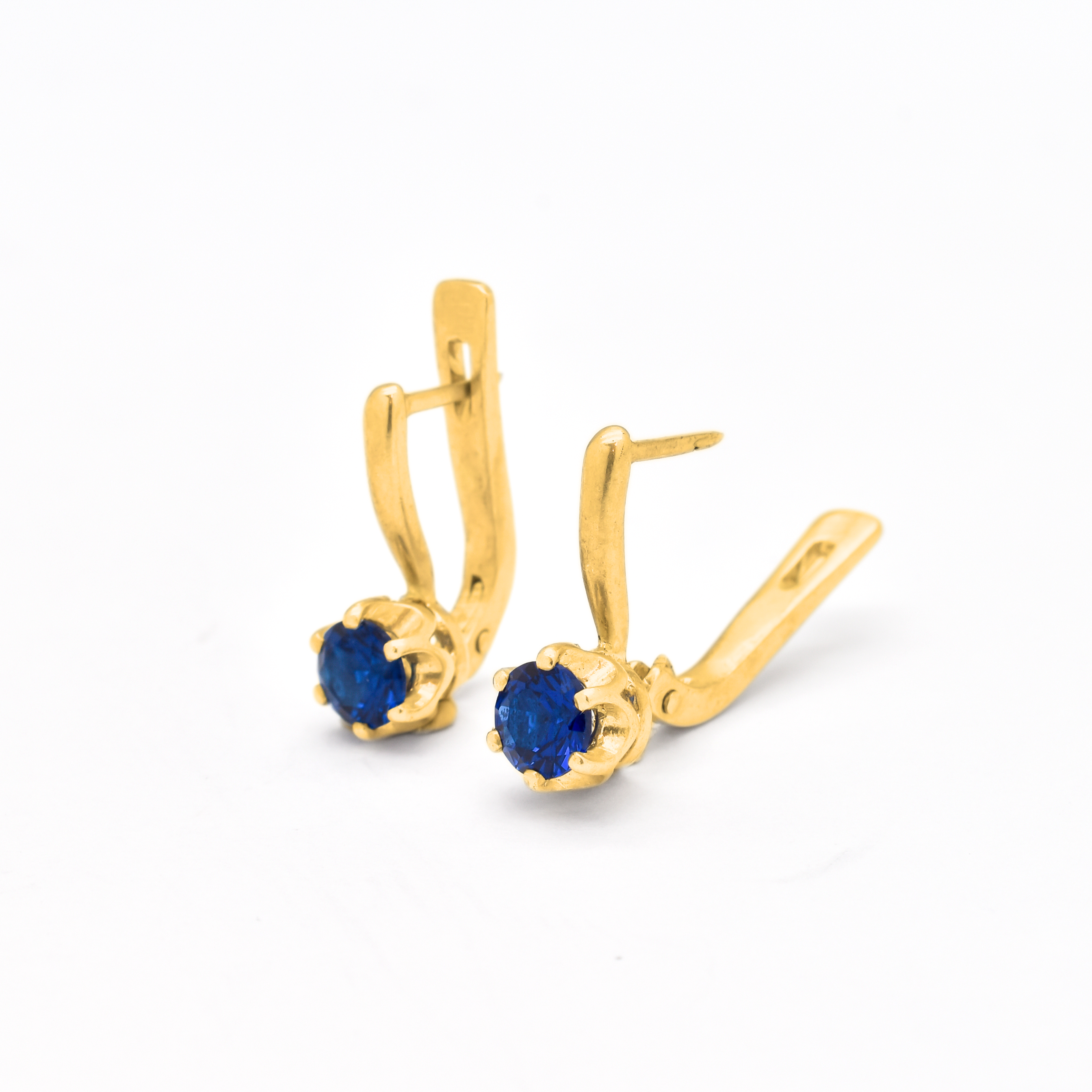 Gold Sapphire Earrings set with a Created Sapphire in a perfect diamond cut, flawless clarity & rich royal blue color, 5mm diameter (1 Ct a pair).