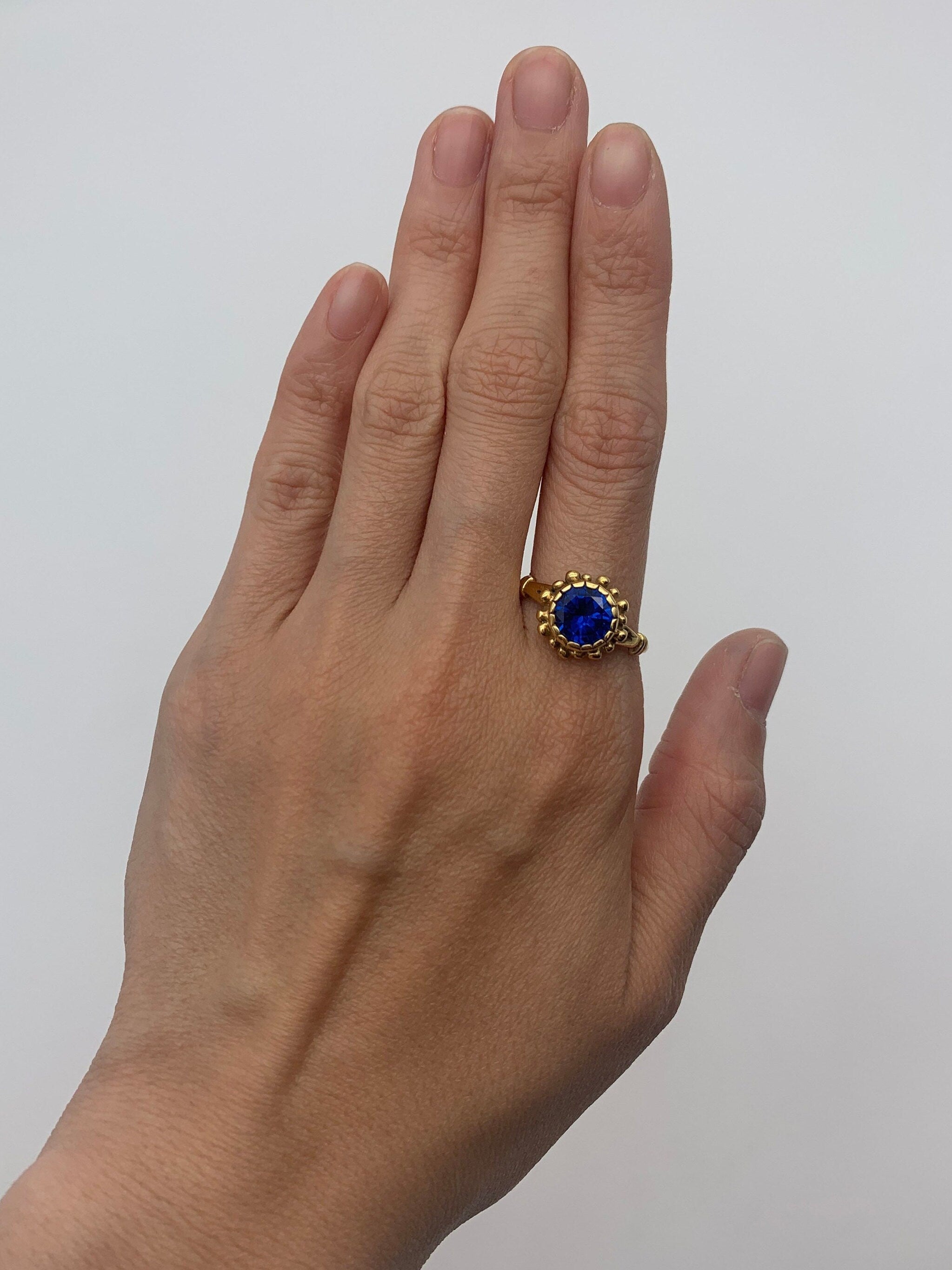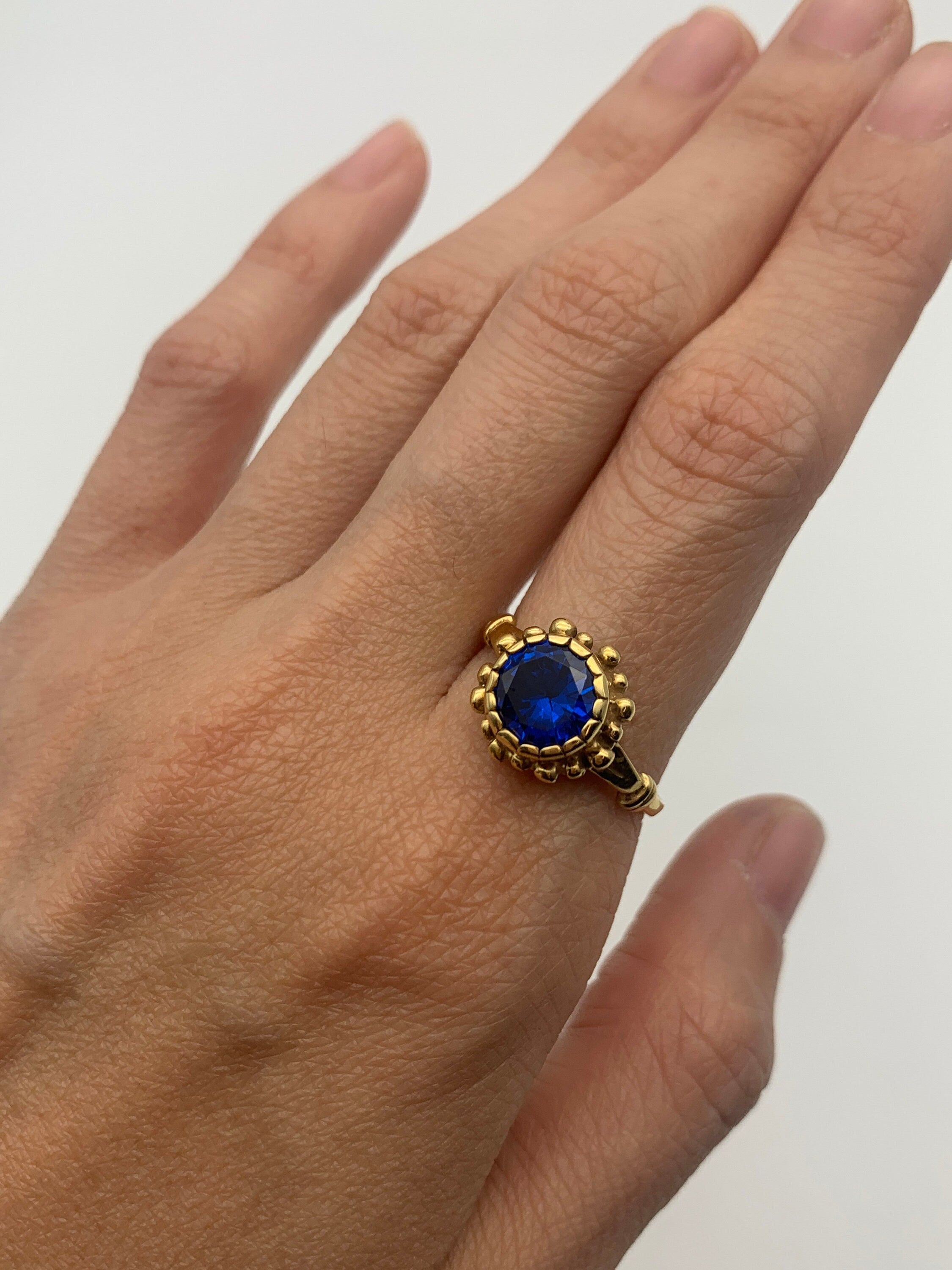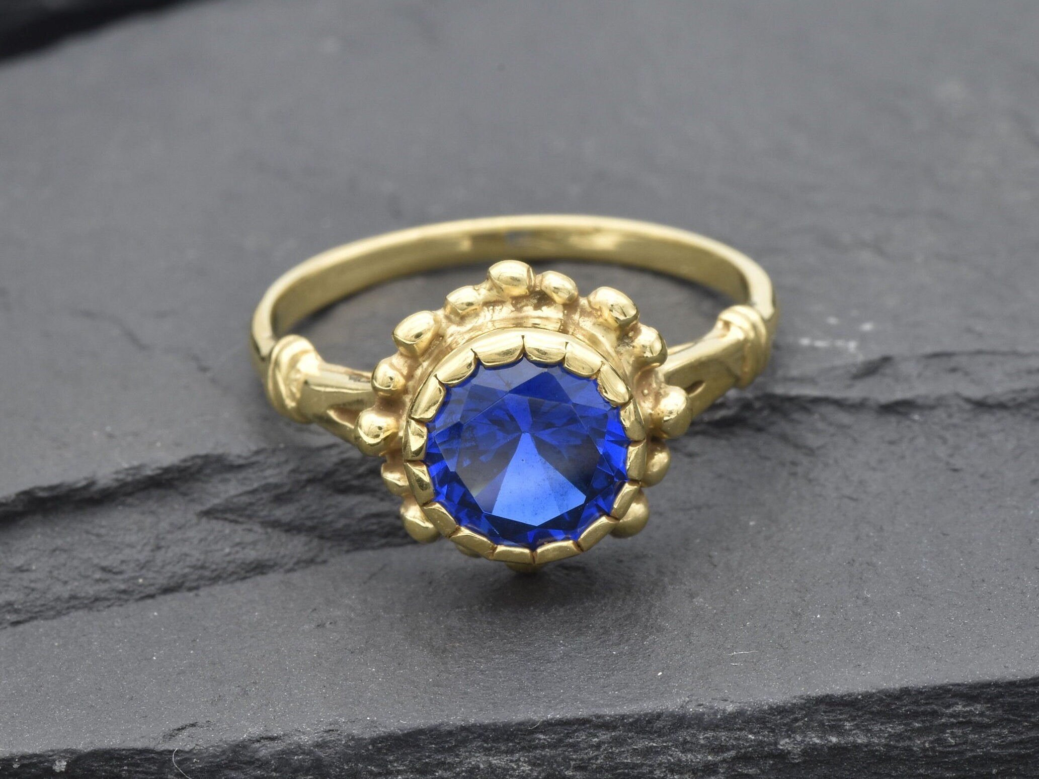 Gold Sapphire Ring - Round Blue Ring - Vintage Flower Ring