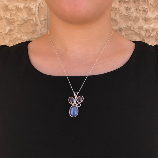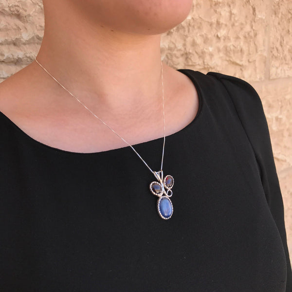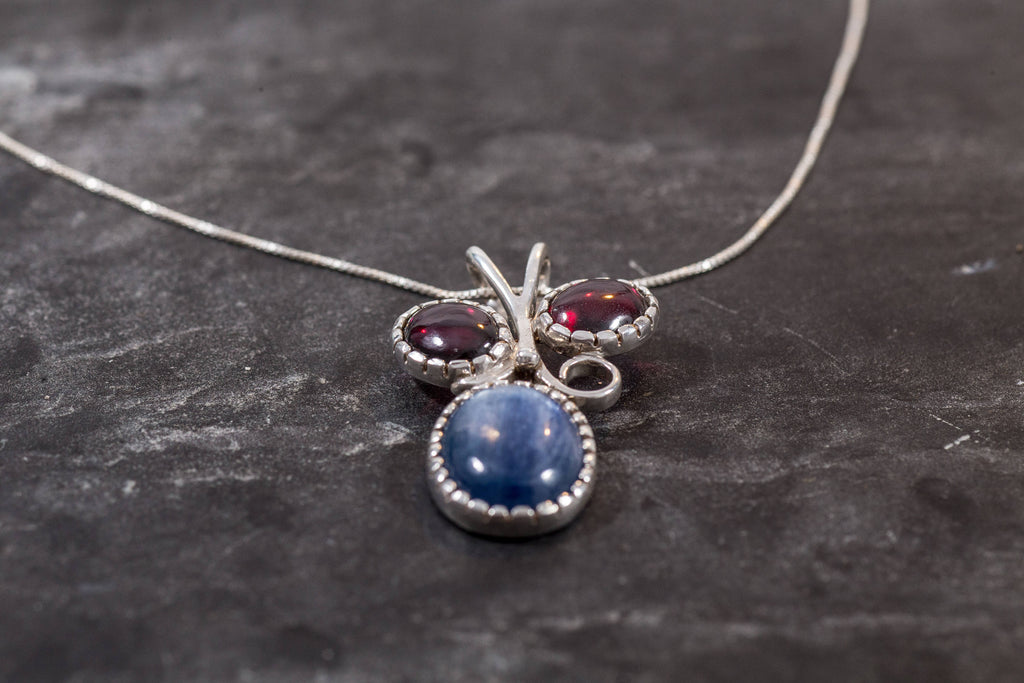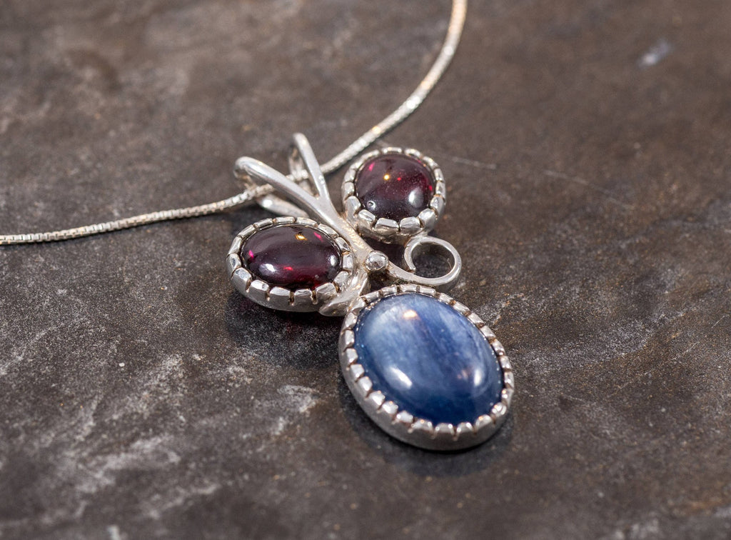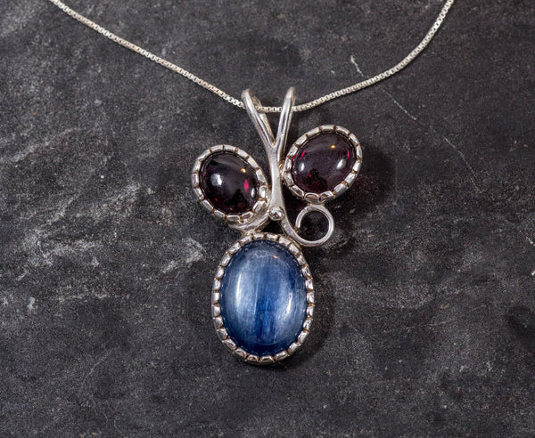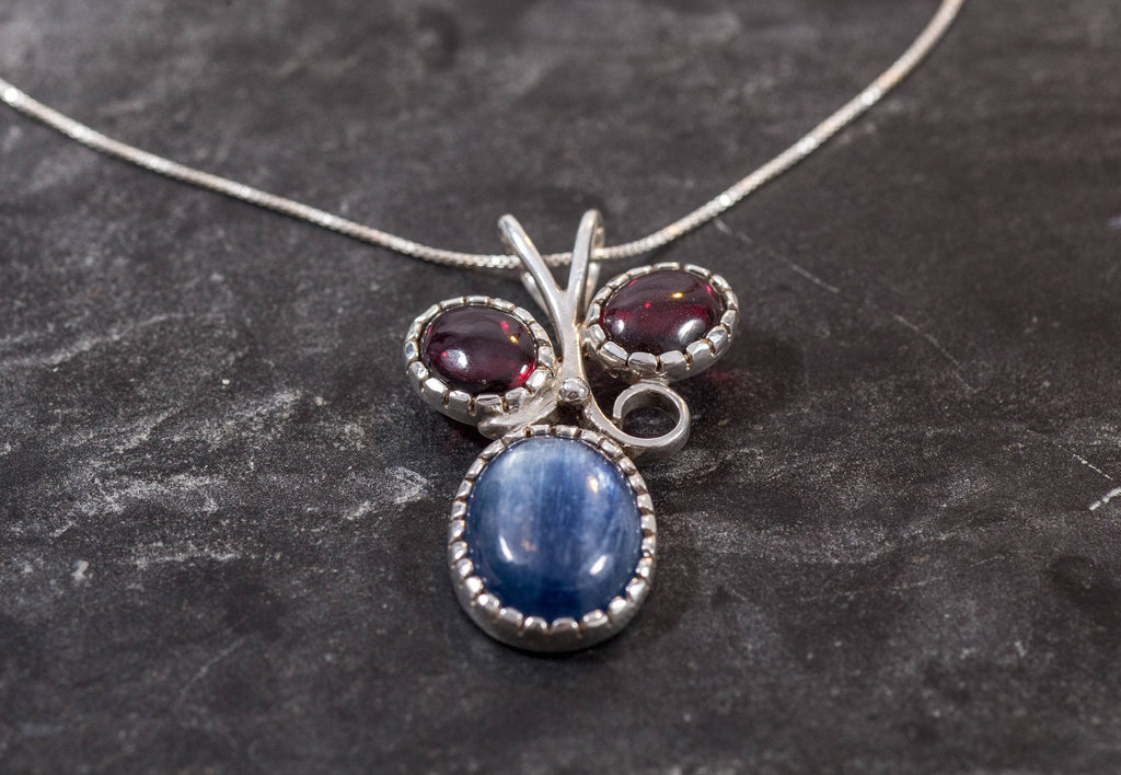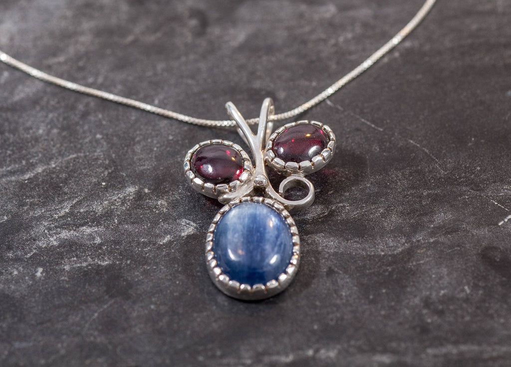 Kyanite Pendant, Garnet Pendant, Natural Garnet, Vine Pendant, January Birthstone, Red Garnet Pendant, Blue Kyanite Pendant, Silver Pendant