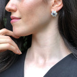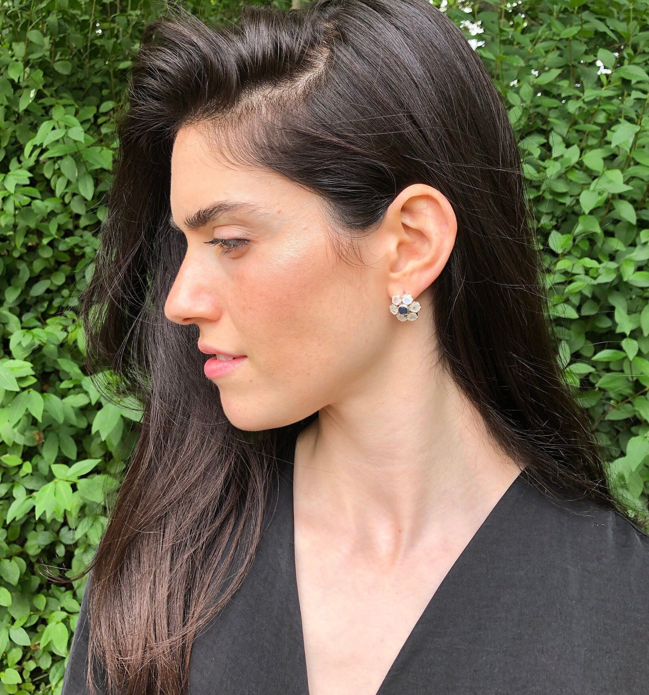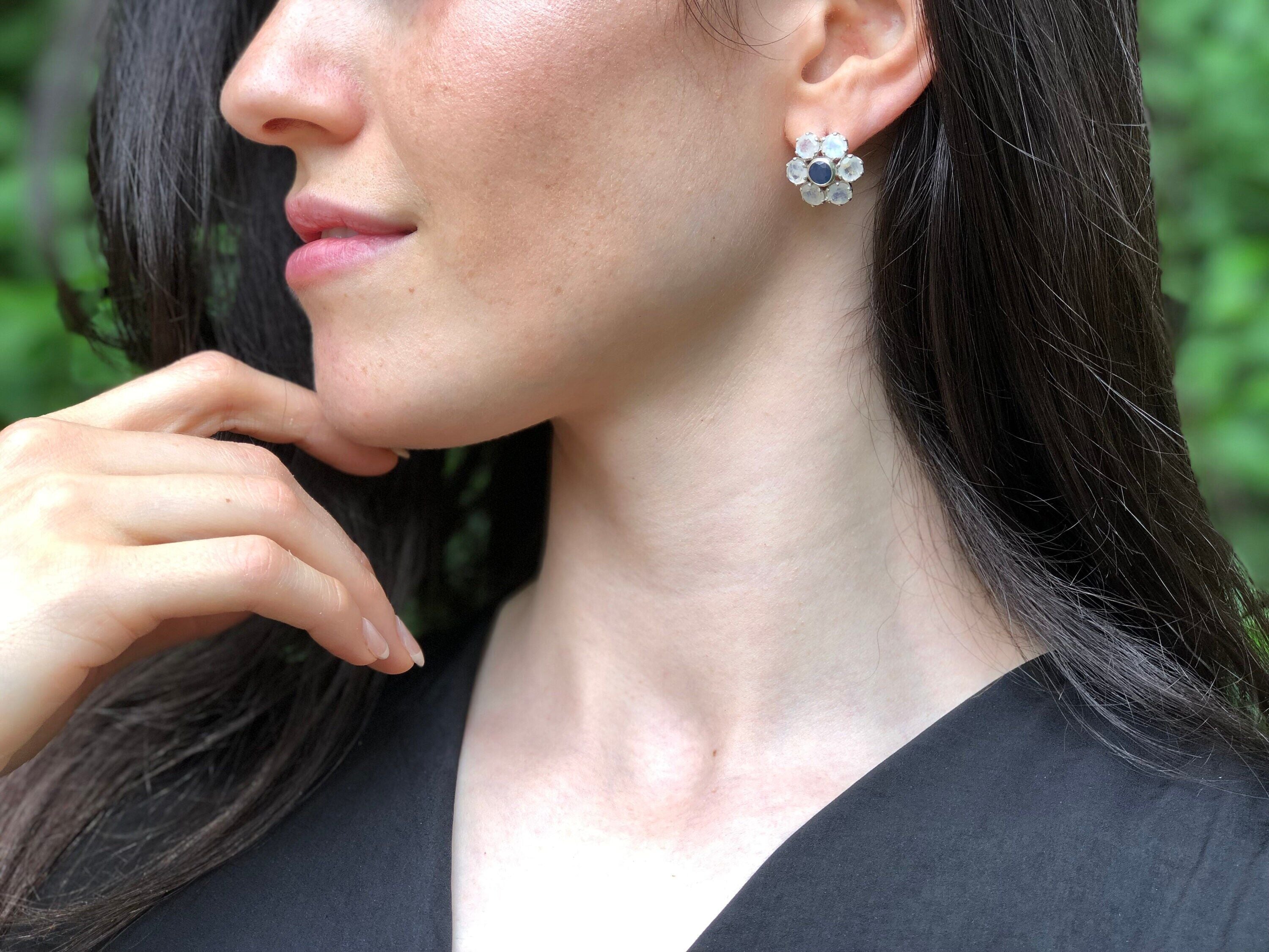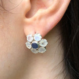 Large Daisy Studs set with Natural Rainbow Moonstone & Natural Sapphire in a diamond cut, at 5mm each (7 Cts a pair) from Madagascar & Burma respectively.
