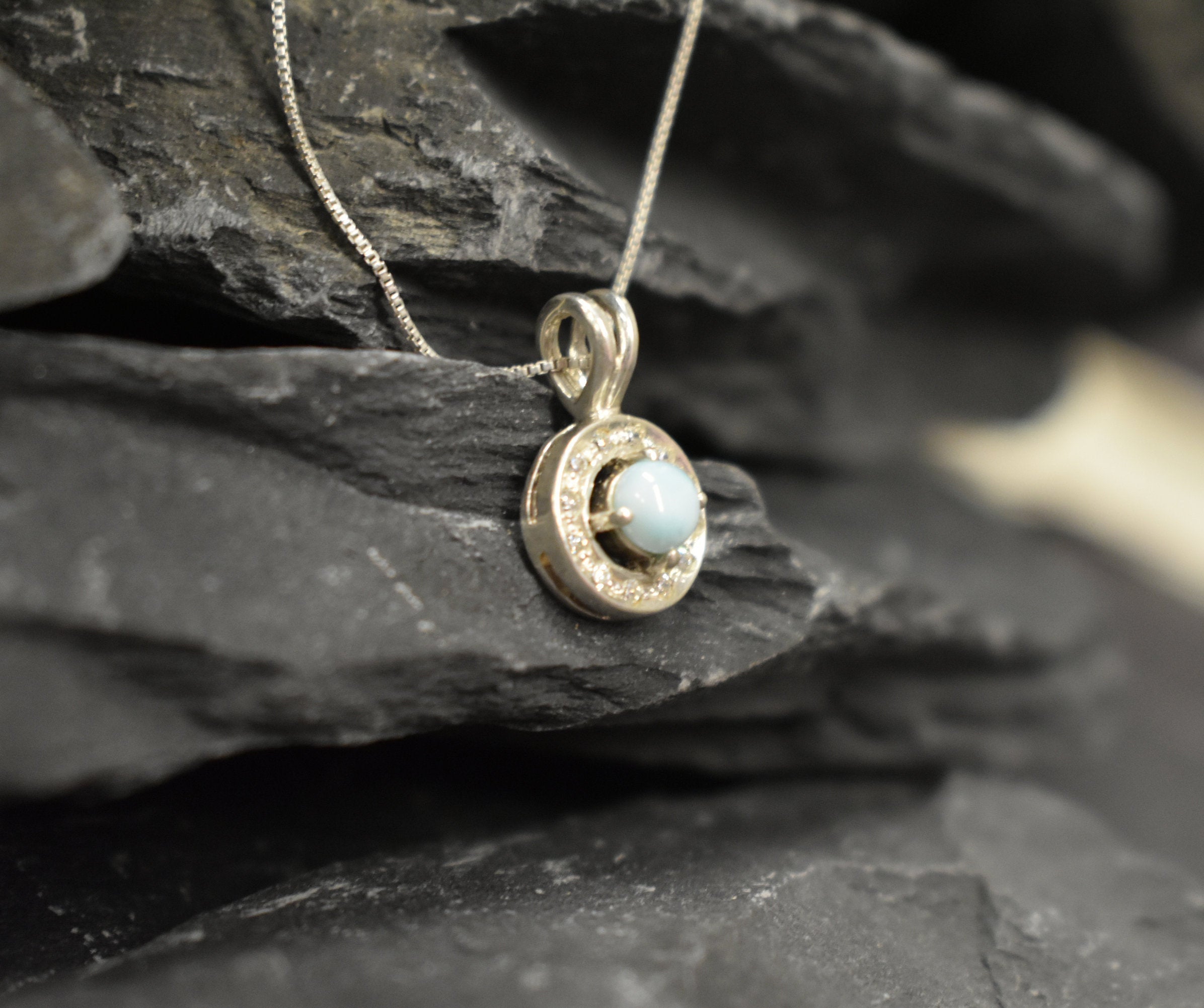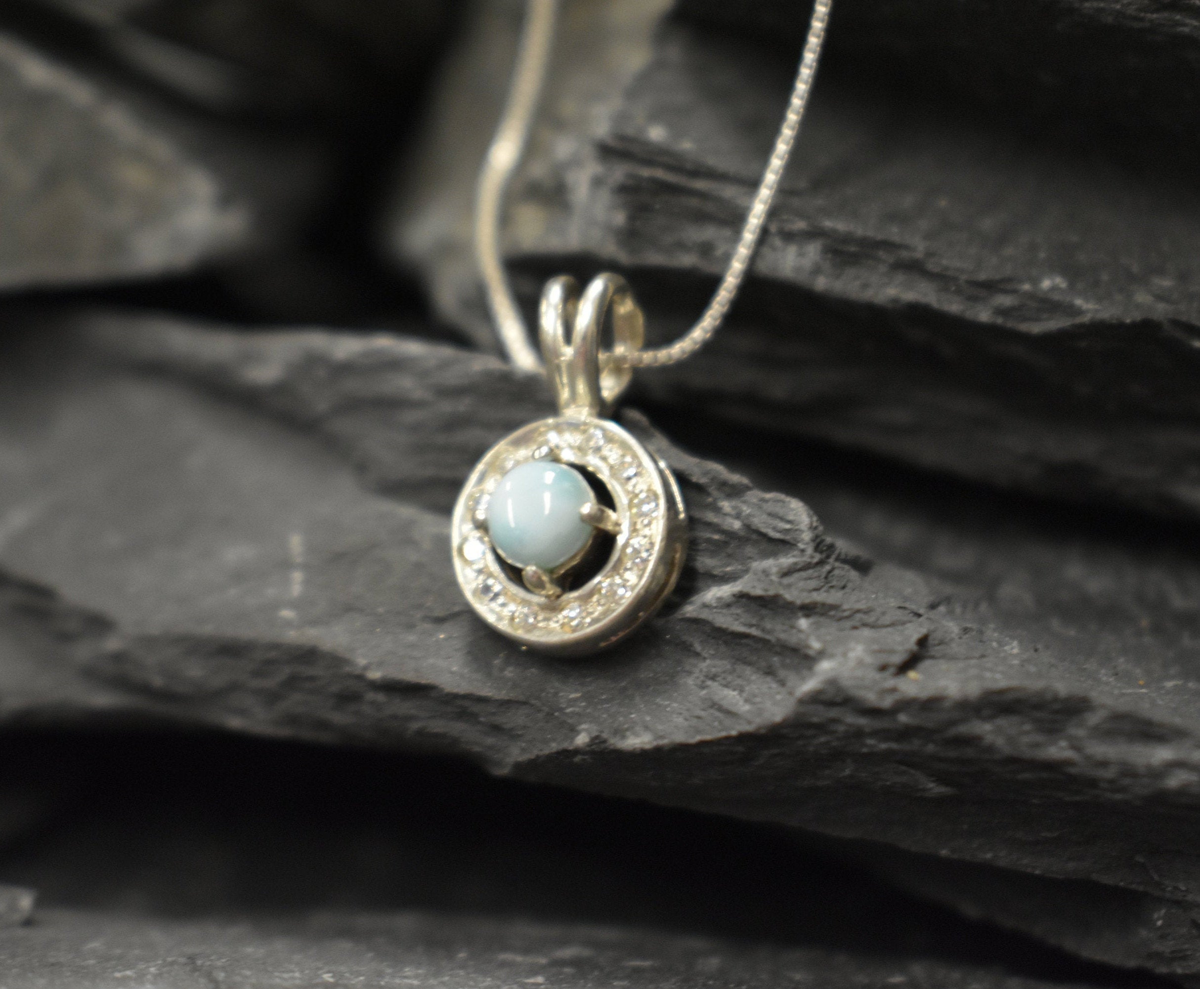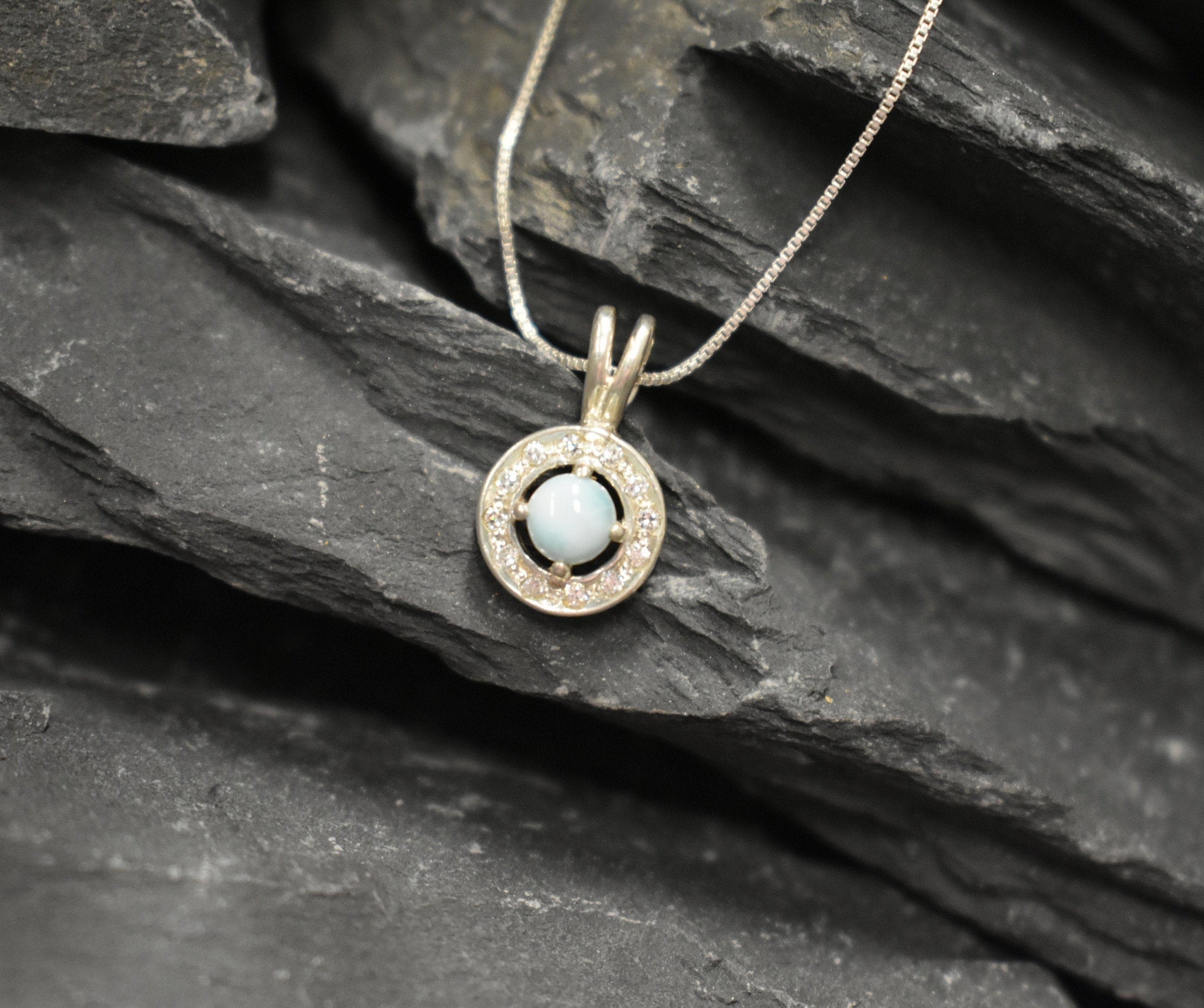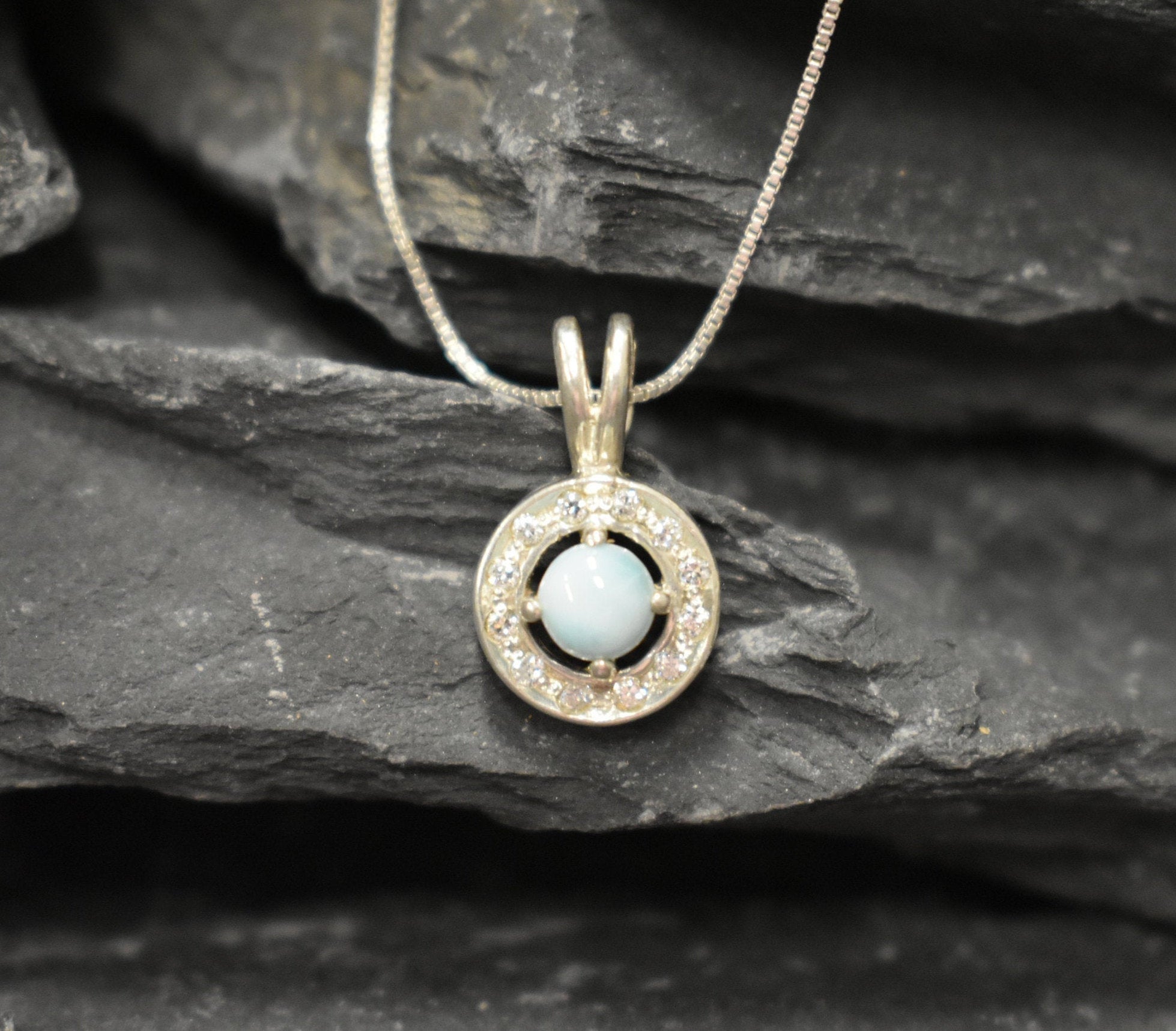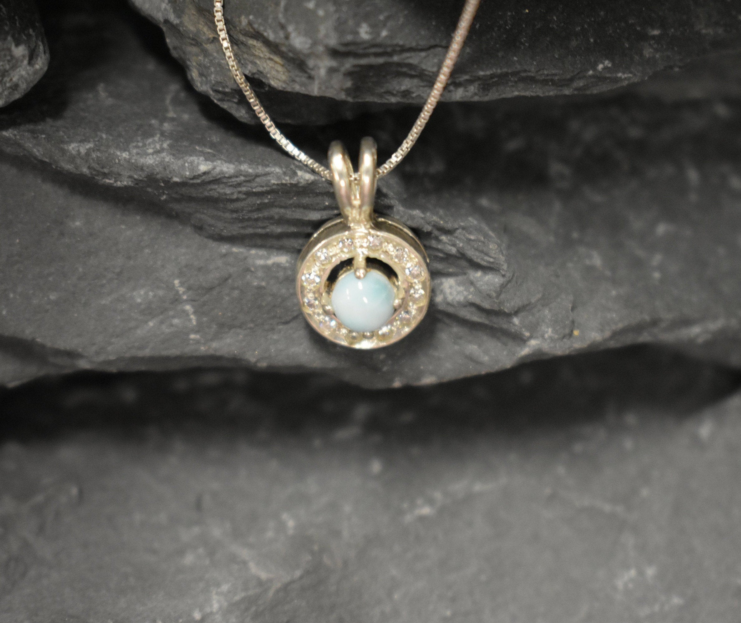 Larimar Pendant set with a Natural Larimar in a top grade & smooth quality "The Divine Jewel of Atlantis", at 5mm size (0.6 Cts) from the Caribbean. Surrounded with CZ diamonds.