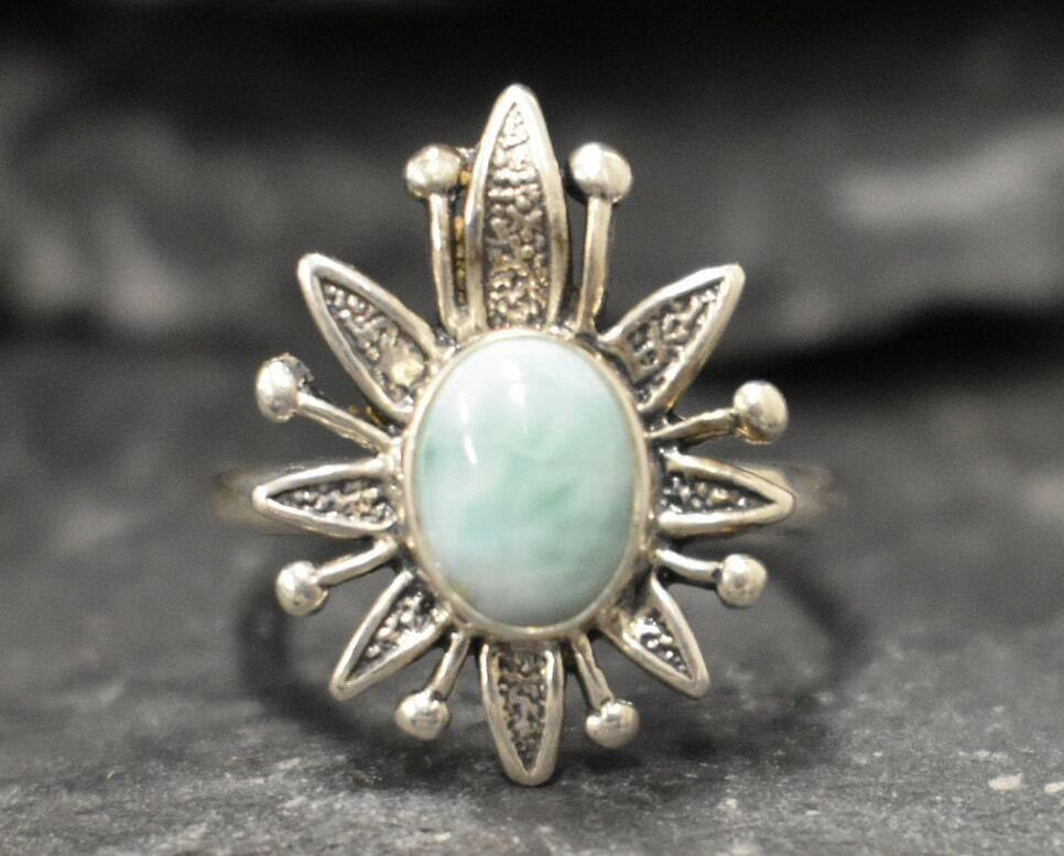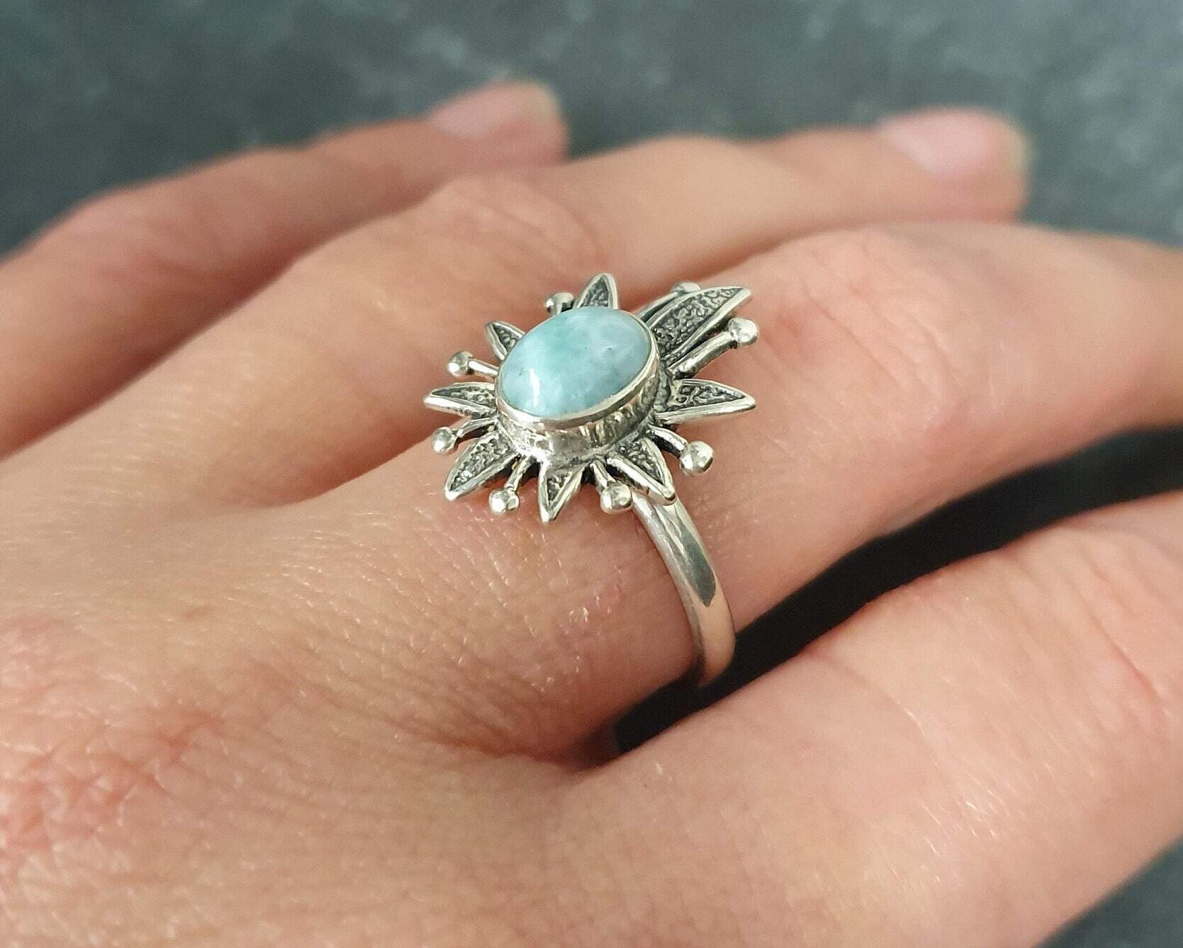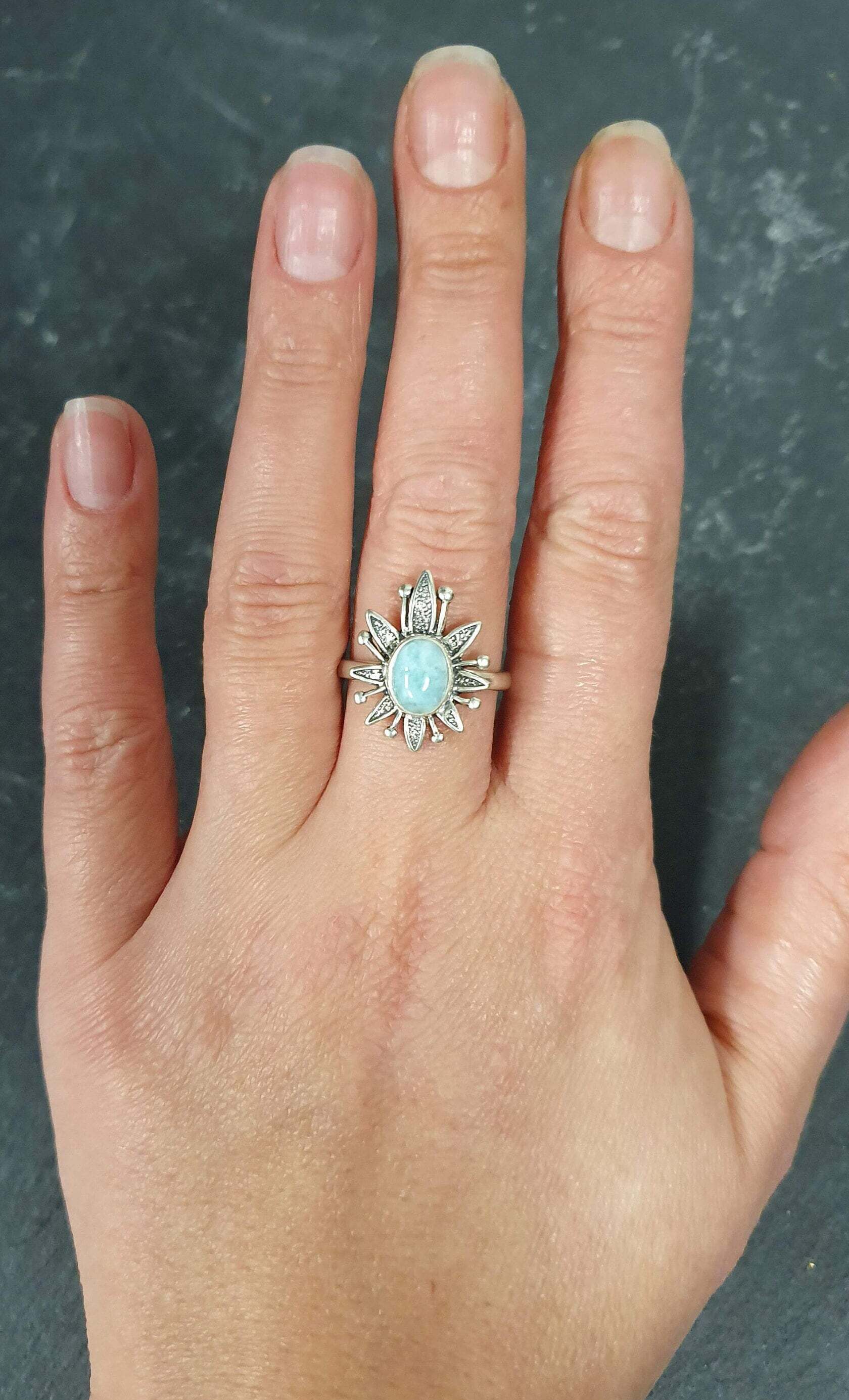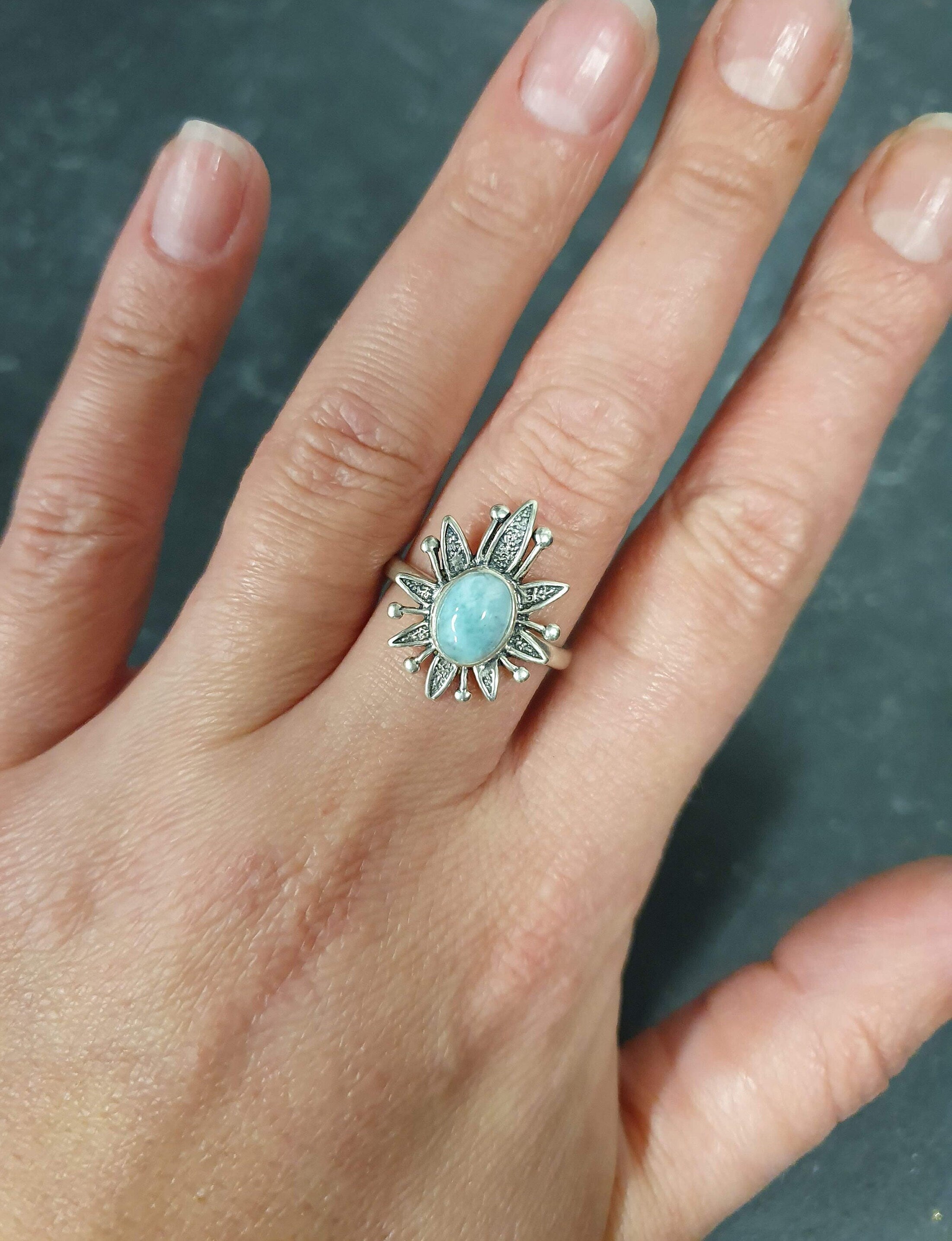 Larimar Ring - Blue Flower Ring - Sun Statement Ring