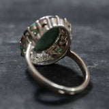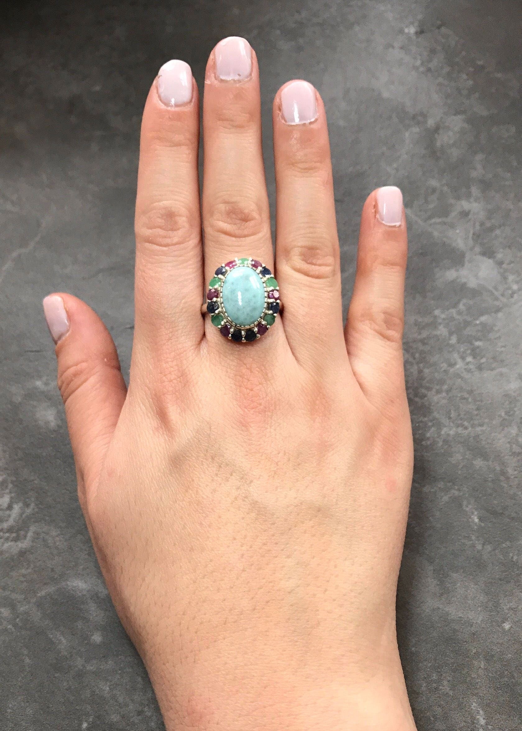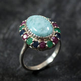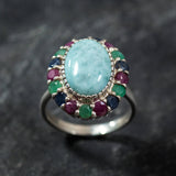 Larimar Ring set with Natural Larimar in a cabochon cut with natural color & inclusions, at size 14x10mm together with Natural Emerald, Ruby, & Sapphire at size 3mm each (8 Cts combined).