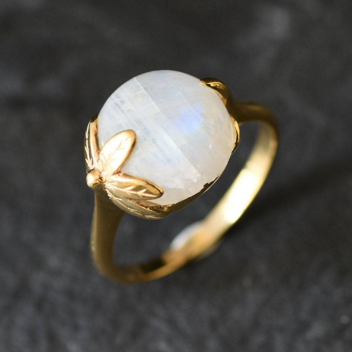 Moonstone Leaf Ring - Statement Boho Ring - Round Moonstone Ring