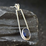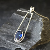 Long Sapphire Pendant set with a Created Sapphire in a perfect diamond cut, flawless clarity & deep blue color, at 14x10mm (6 Cts).
