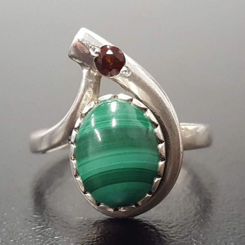 Malachite Ring, Natural Malachite, Natural Garnet, Unique Stone Ring, Green Ring, Vintage Ring, Silver Ring, Green Statement Ring, Malachite