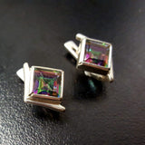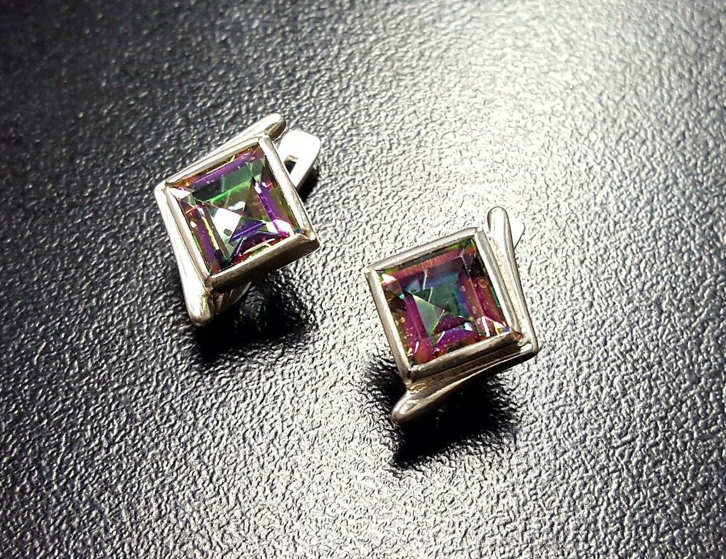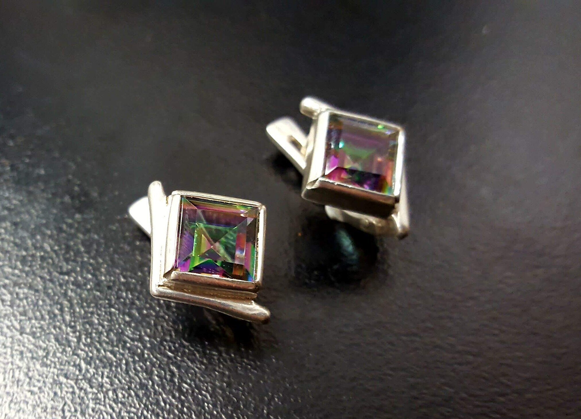 Mystic Topaz Earrings, Natural Mystic Topaz, Square Earrings, Asymmetric Earrings, Rainbow Earrings, Sparkly Earrings, 925 Silver Earrings