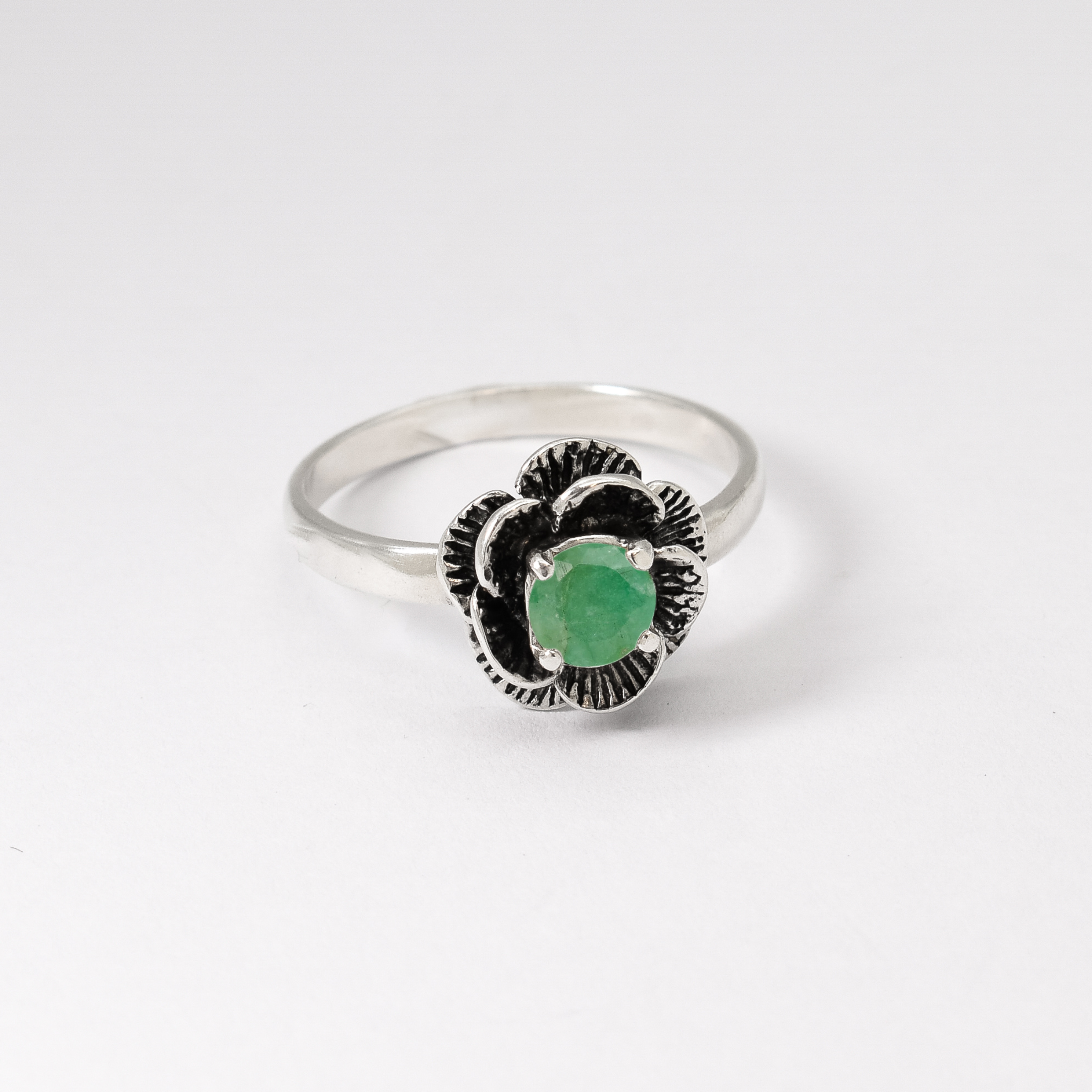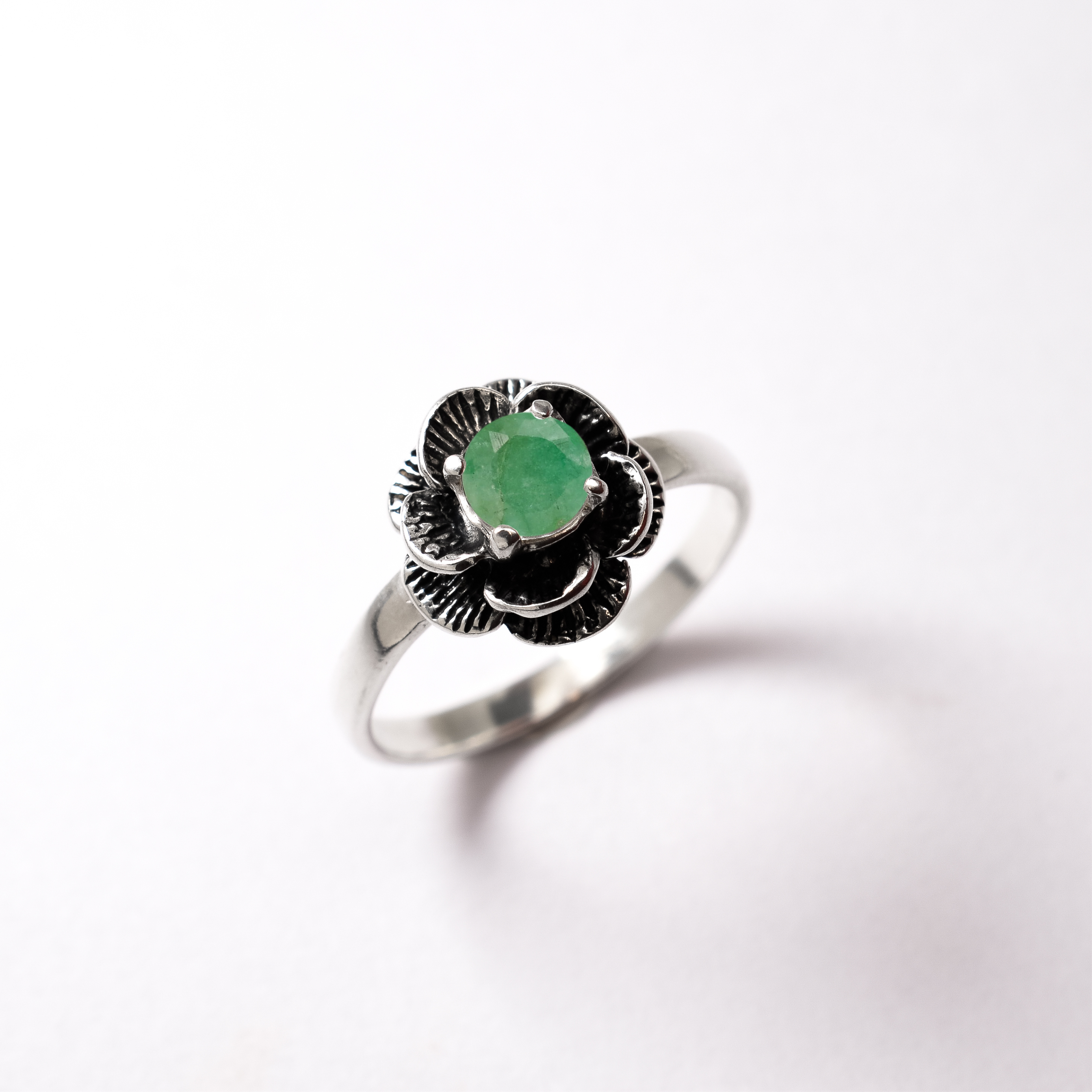 Emerald Flower Ring - Silver Rose Ring - May Birthstone Ring