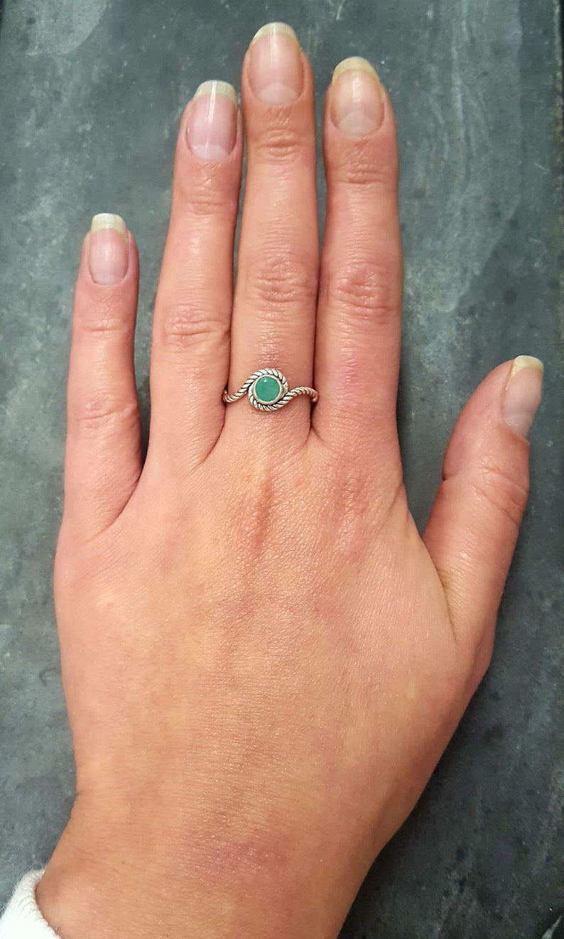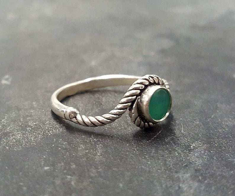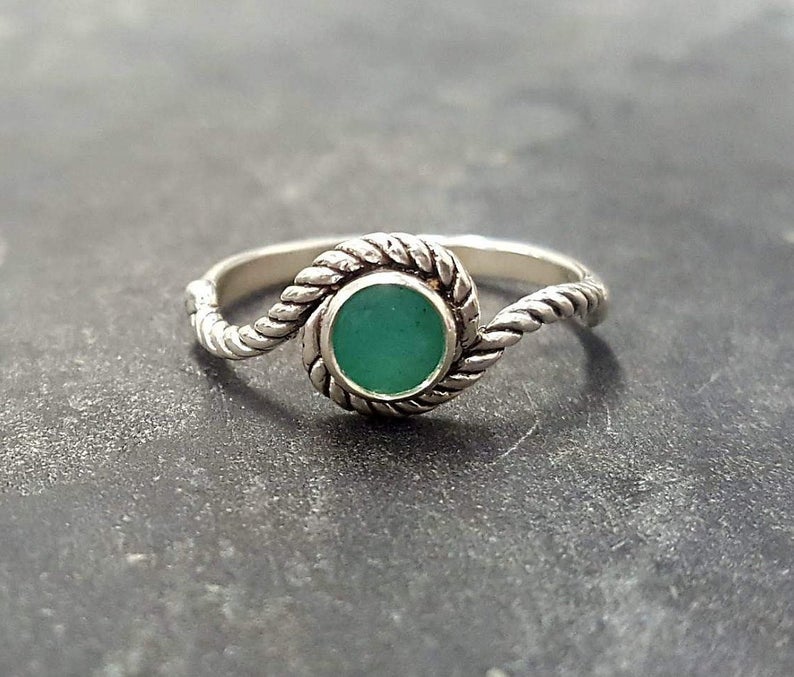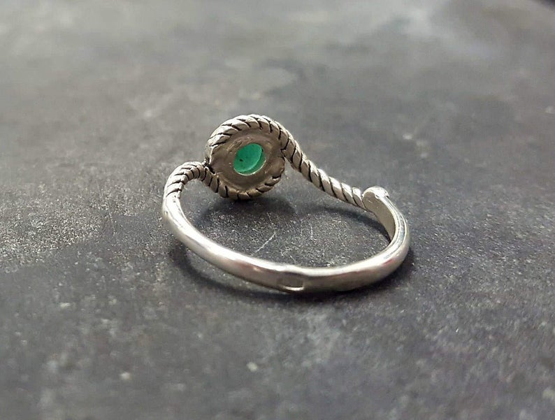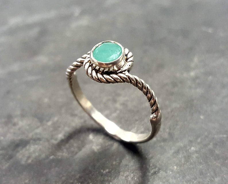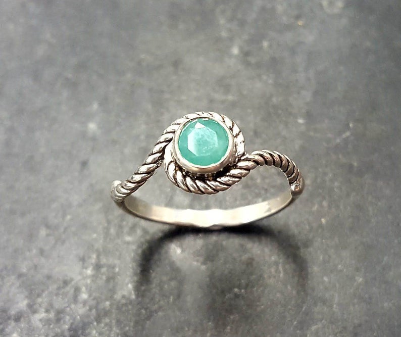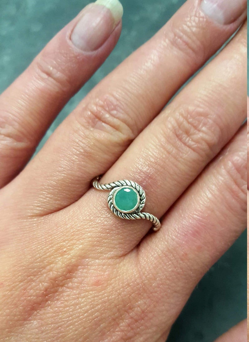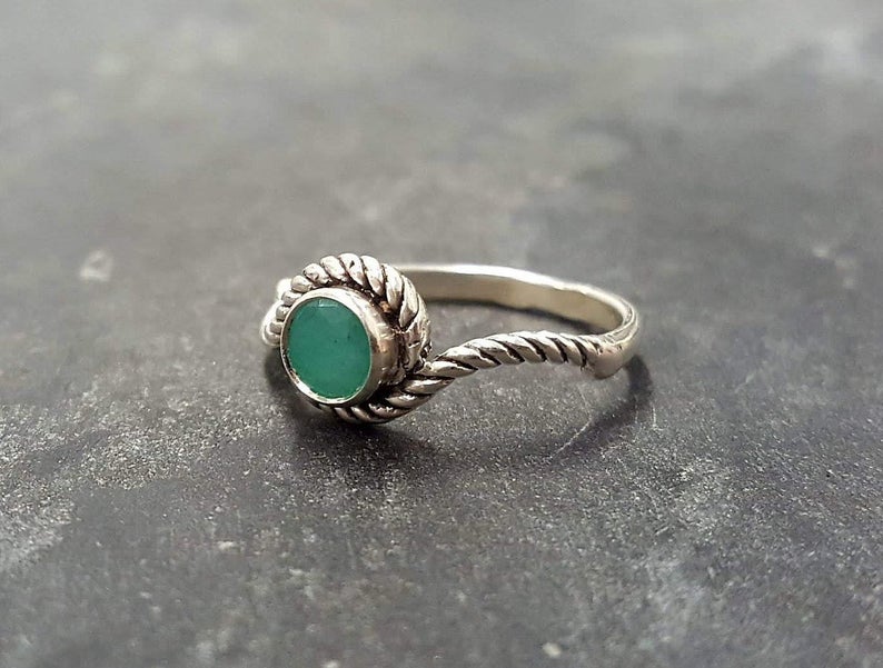 Dainty Emerald Ring - Silver Rope Band - May Birthstone Ring