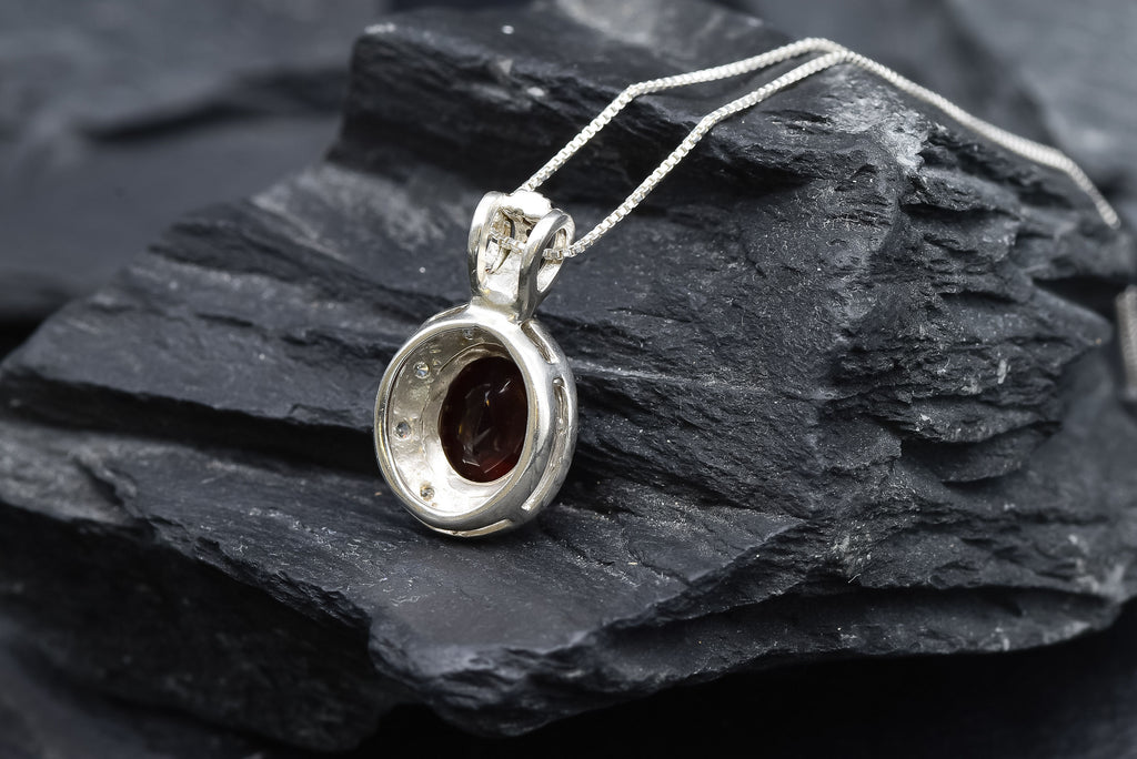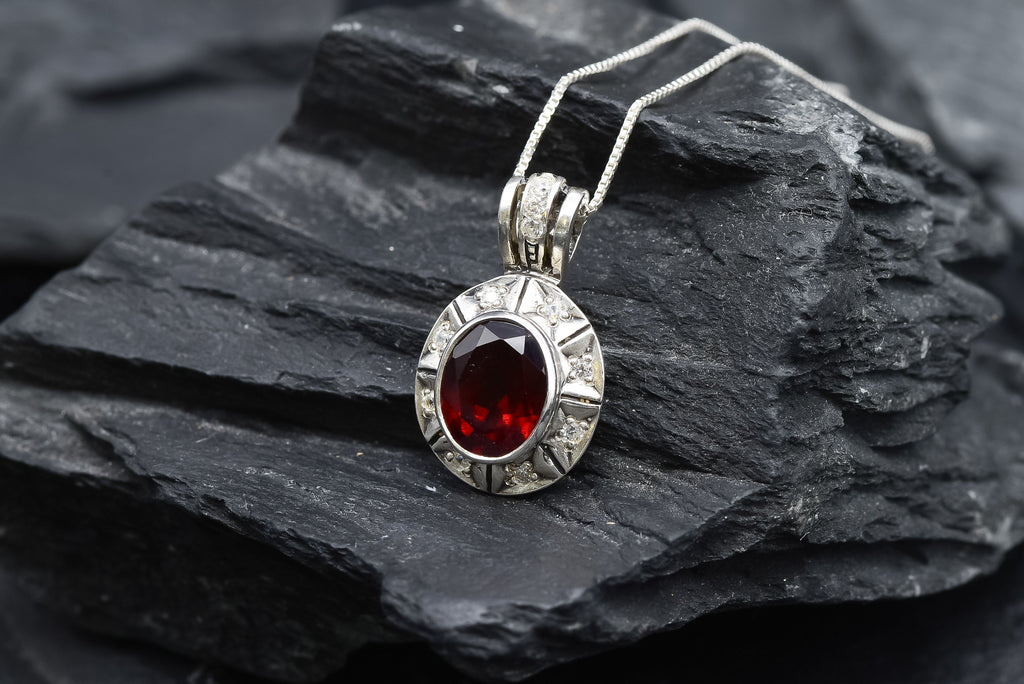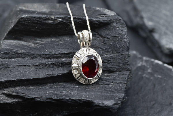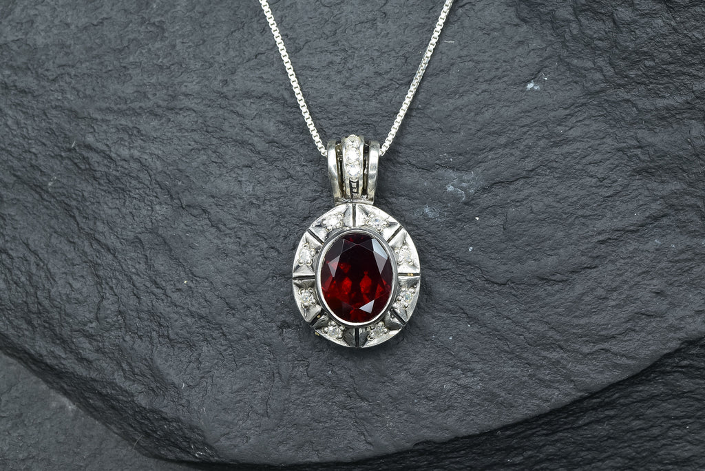 Red Garnet Necklace set with a Natural Garnet in a diamond cut & deep red color, at 10x8mm size (3 Cts) from Mozambique.