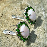 Flower Opal Earrings set with a Natural Australian Opal in a top grade with a natural play of color, at 10x8mm (6 Cts a pair) from Australia. Surrounded by Natural Chrome Diopside, at 3mm each.