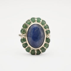 Opal and Emerald Large Cocktail Ring in sterling silver featuring an oval white opal cabochon framed with genuine emerald petals, a statement jewelry style that radiates flashes of fire colors while symbolizing love and renewal, making it a meaningful October and May birthstone gift idea. Perfect for weddings, cocktail parties, and formal evening events where a bold elegant look is desired.