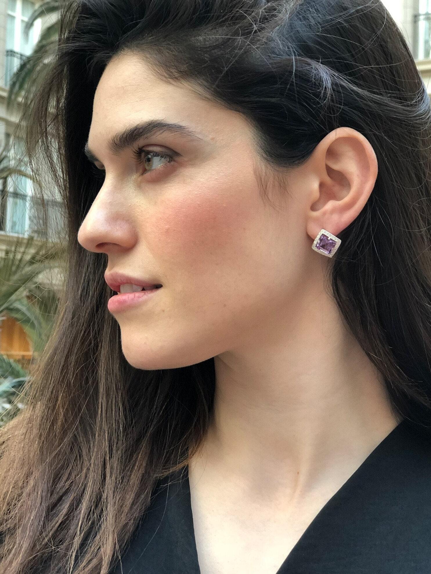 Rose Quartz Earrings set with Natural Rose Quartz in a top grade, princess cut & smoky pink color at 8x8mm (6 Cts a pair) from Brazil.