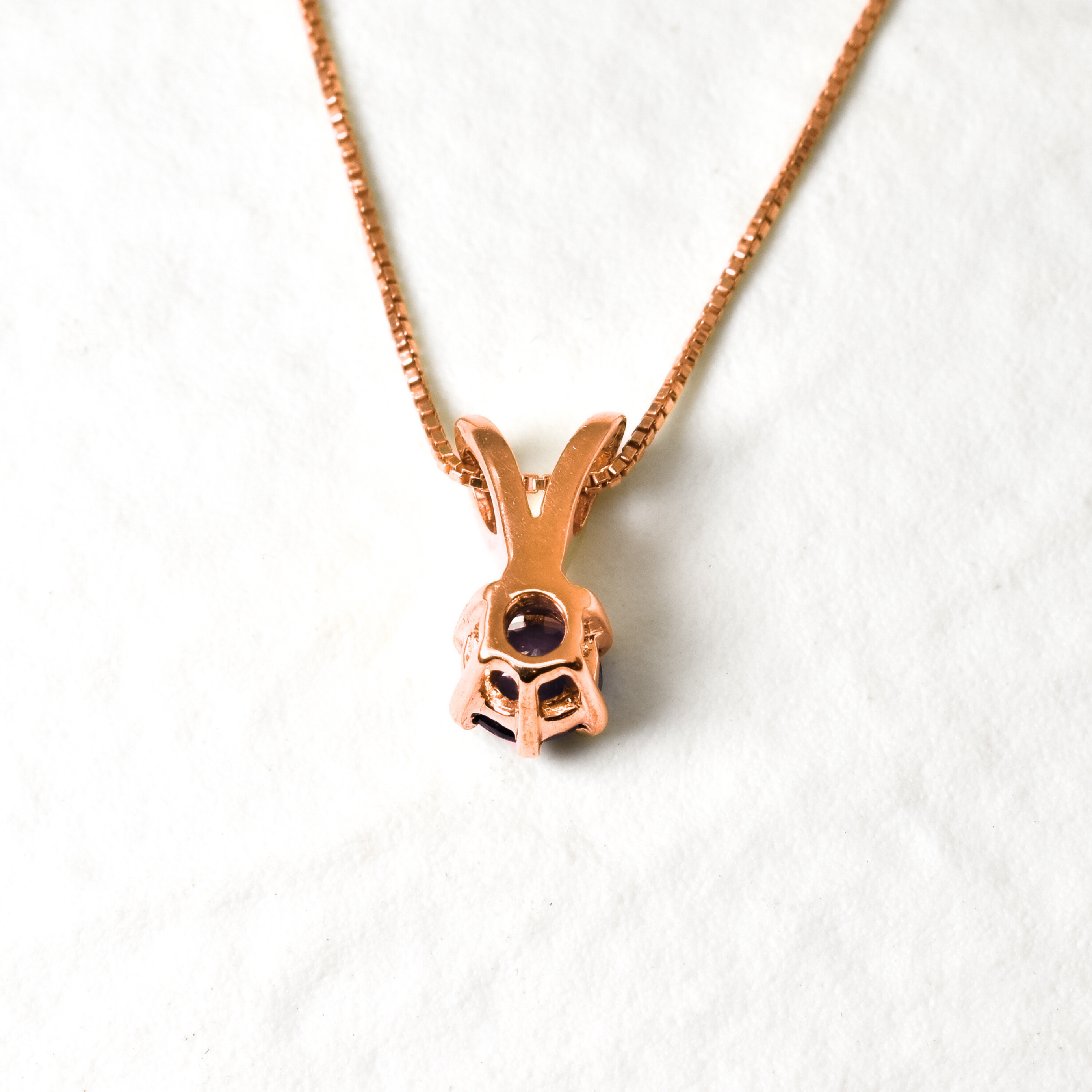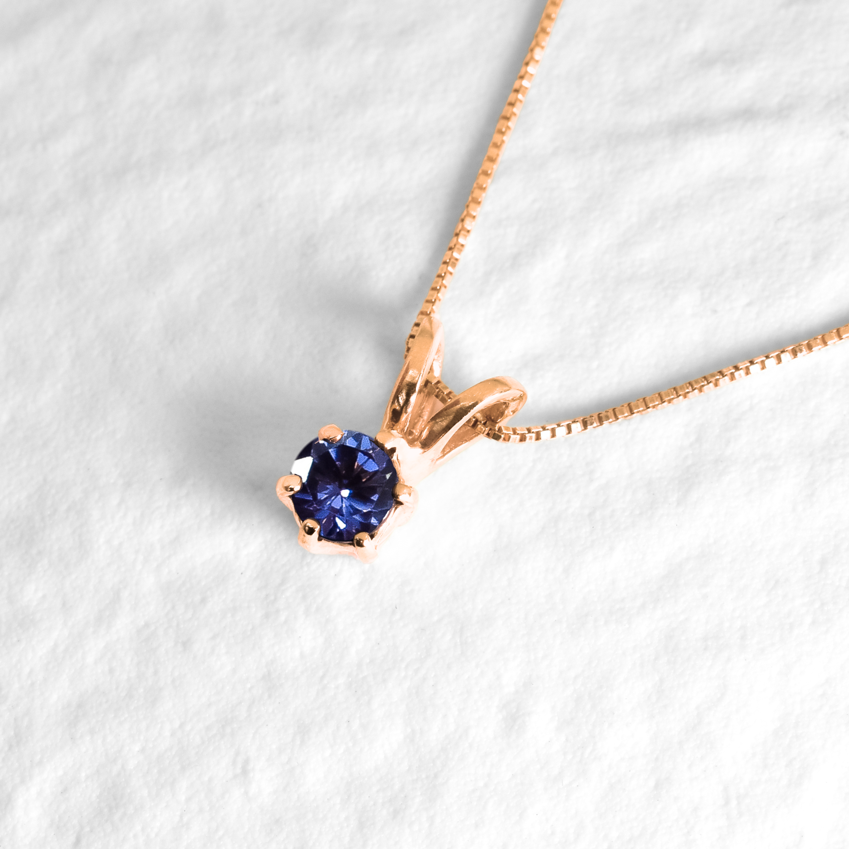 Rose Gold Tanzanite Pendant set with a Created Tanzanite in a perfect diamond cut, flawless clarity & stunning purple/blue color, at 5mm diameter, 0.5 Carat.