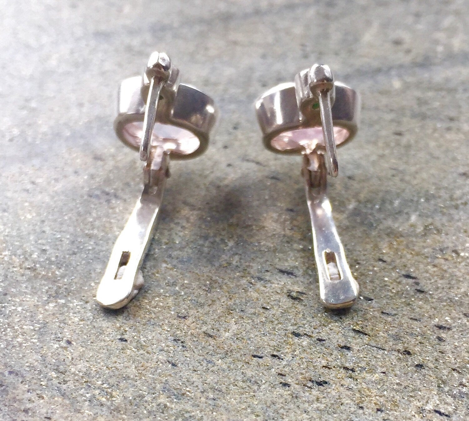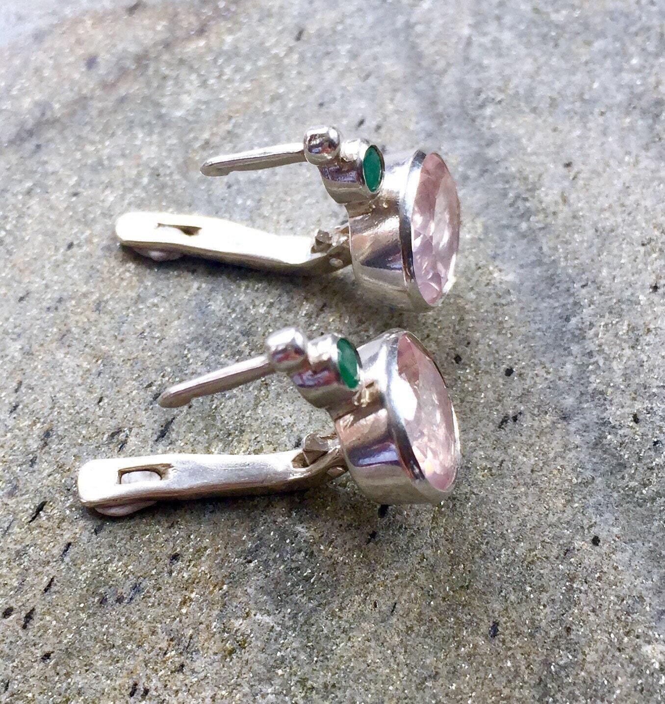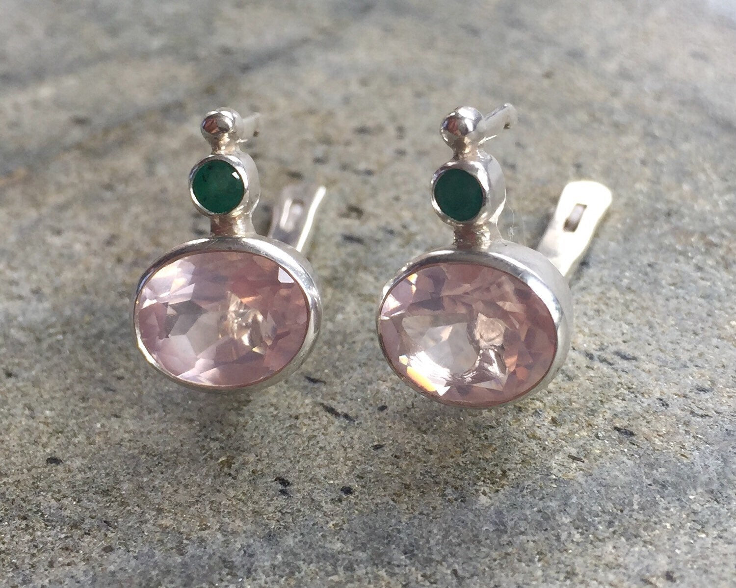 Rose Quartz Earrings, Natural Rose Quartz, Emerald Earrings, Natural Emerald, Pink Earrings, Vintage Earrings, Sterling Silver Earrings