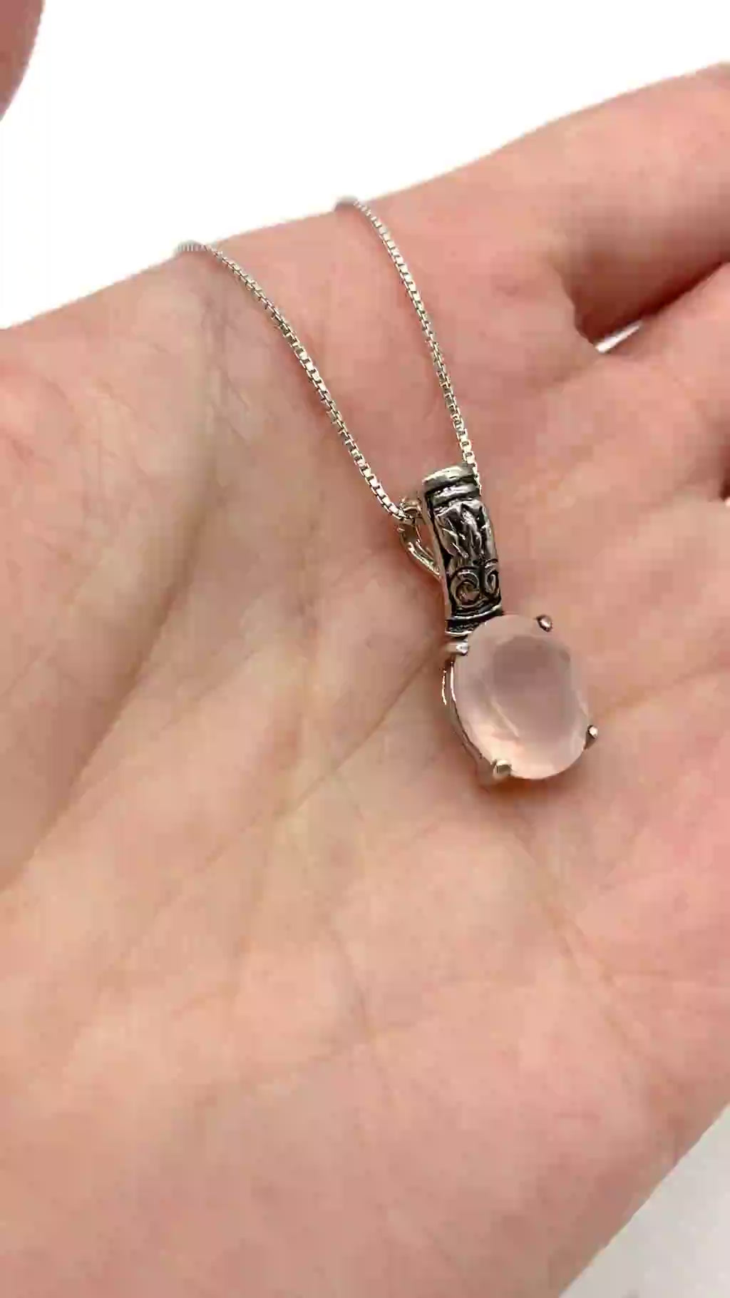 Rose Quartz Necklace set with Natural Rose Quartz in a diamond cut & lovely pale pink color, 10x8mm (3 Cts) from Brazil. Solid 925 Sterling Silver ☞ made to last.