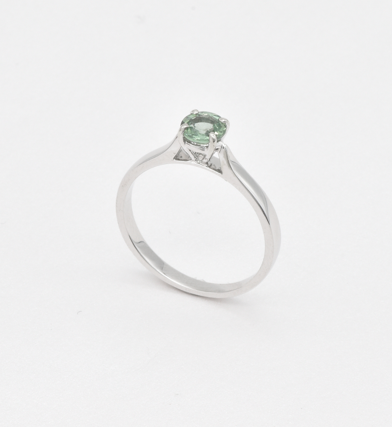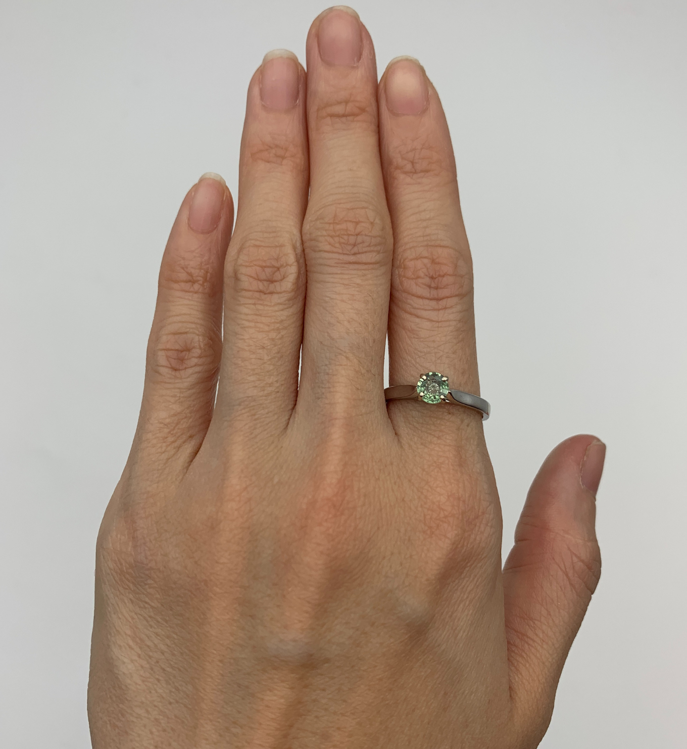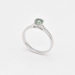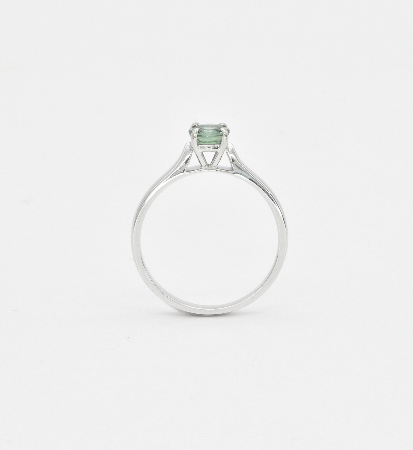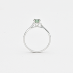 This ring features a unique Green Sapphire stone set with 2.4 grams of Solid 18k White Gold in a solitaire setting, perfect to gift to your special someone. It's the perfect piece that they'll treasure forever.