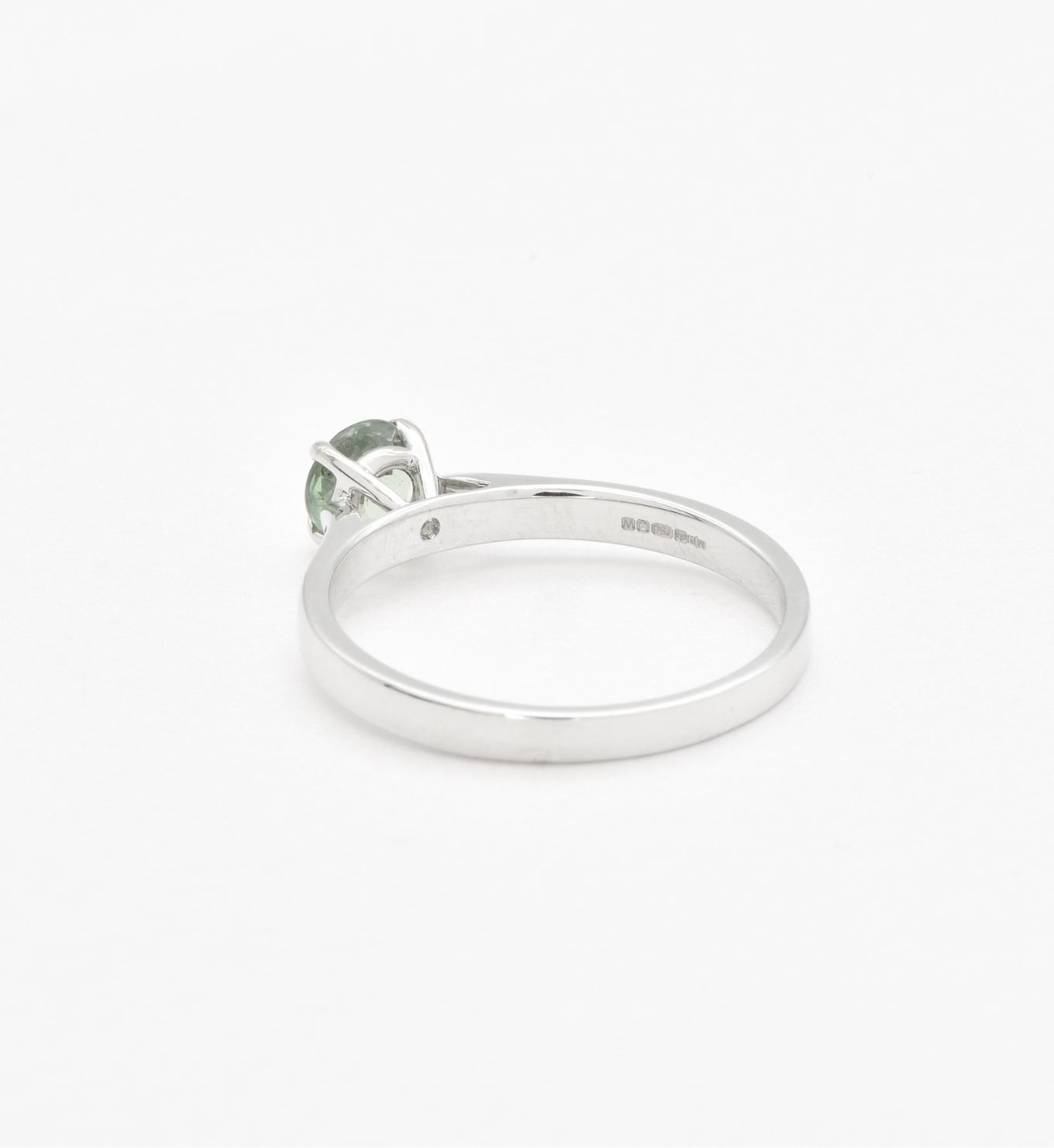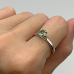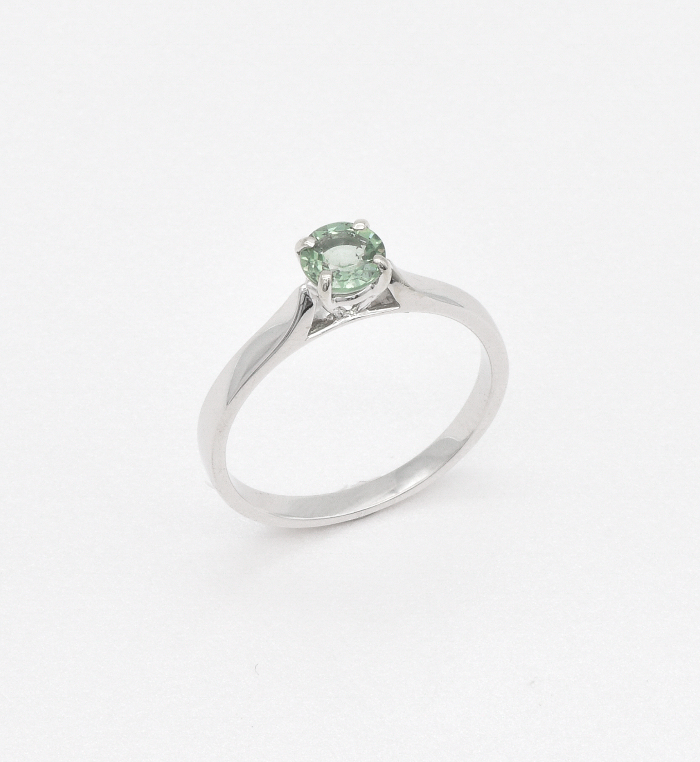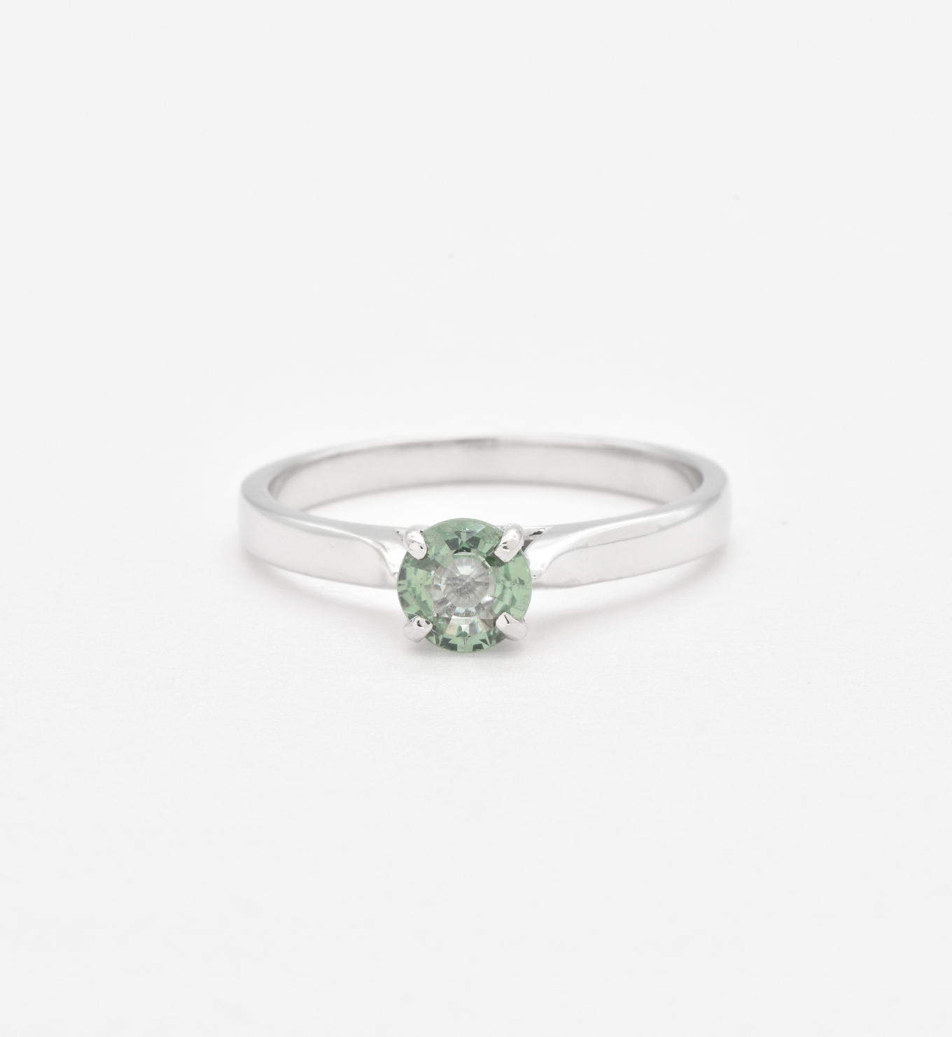 This ring features a unique Green Sapphire stone set with 2.4 grams of Solid 18k White Gold in a solitaire setting, perfect to gift to your special someone. It's the perfect piece that they'll treasure forever.