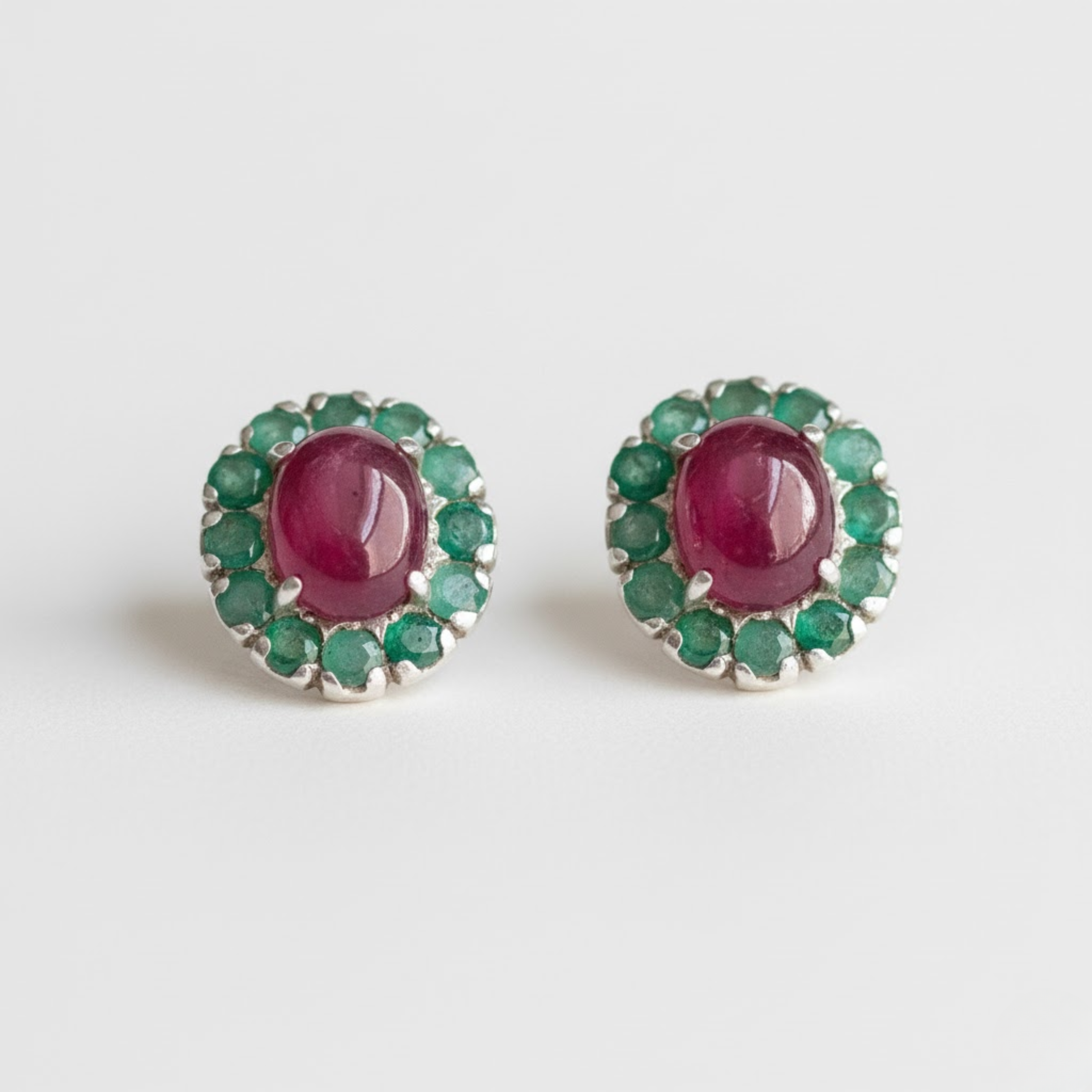 Victorian Emerald Earrings set with a Natural Emeralds in a diamond cut at 3mm each. With Natural Ruby set in the center in a stunning smooth quality, at 10x8mm each (6 Cts pair) from Burma.