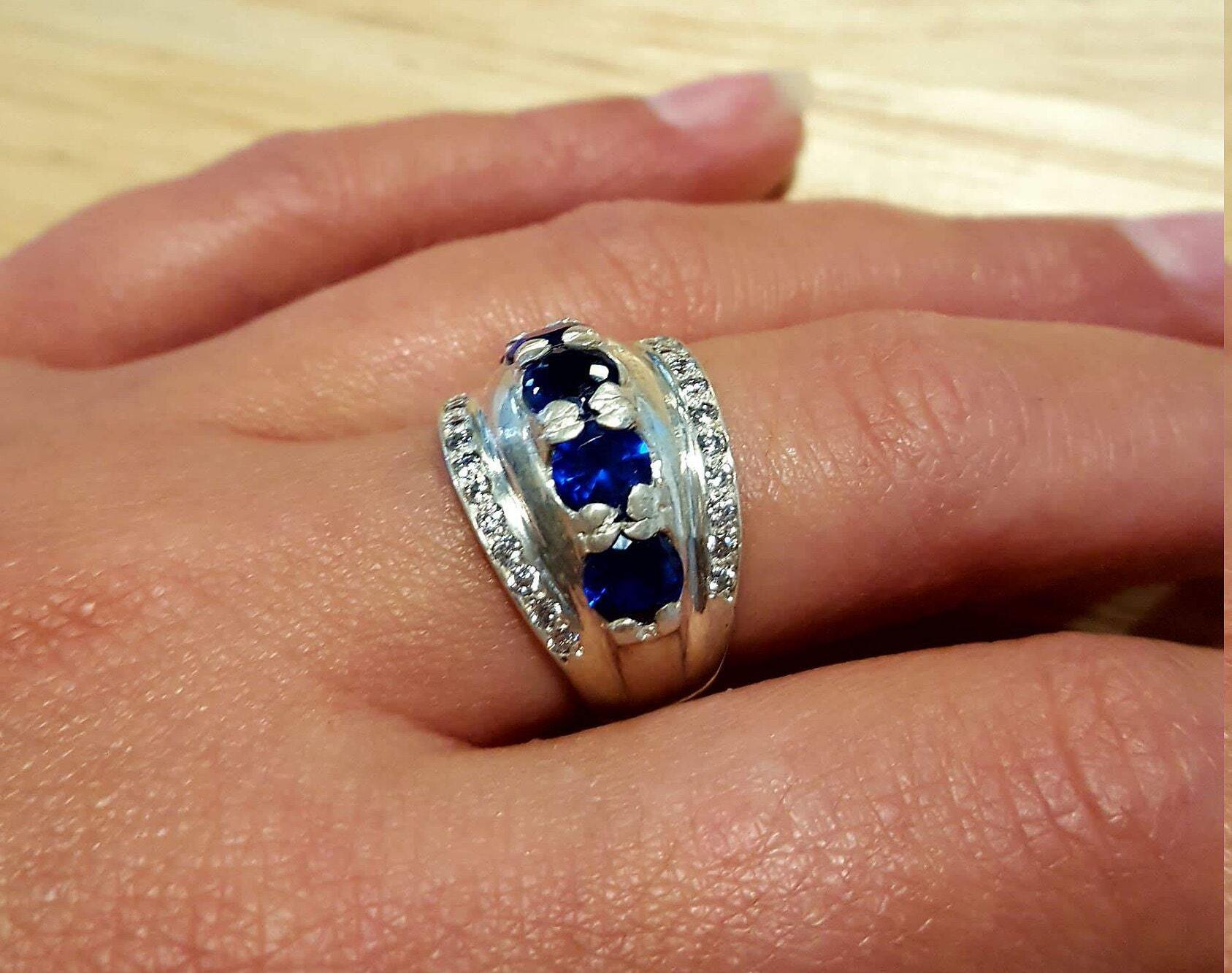 Sapphire Statement Ring set with a Created Sapphire in a diamond cut & flawless clarity & color, at size 5mm each (3 Cts combined).