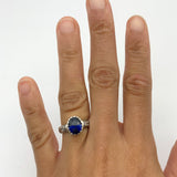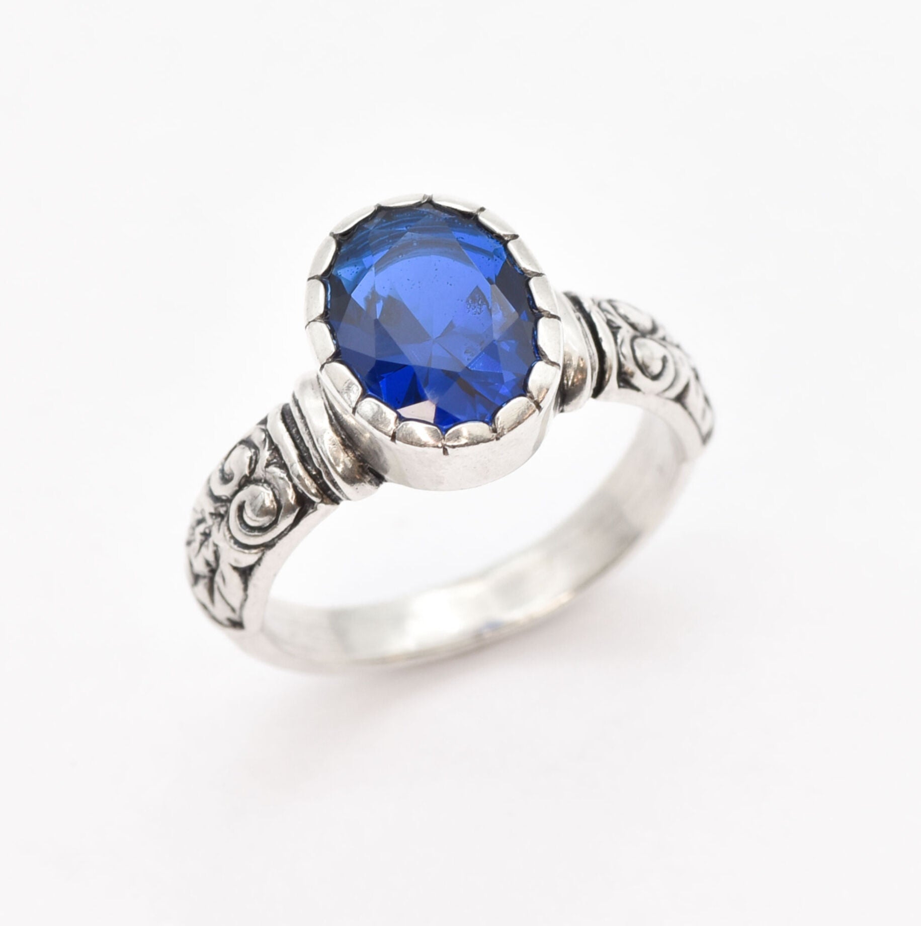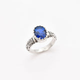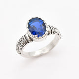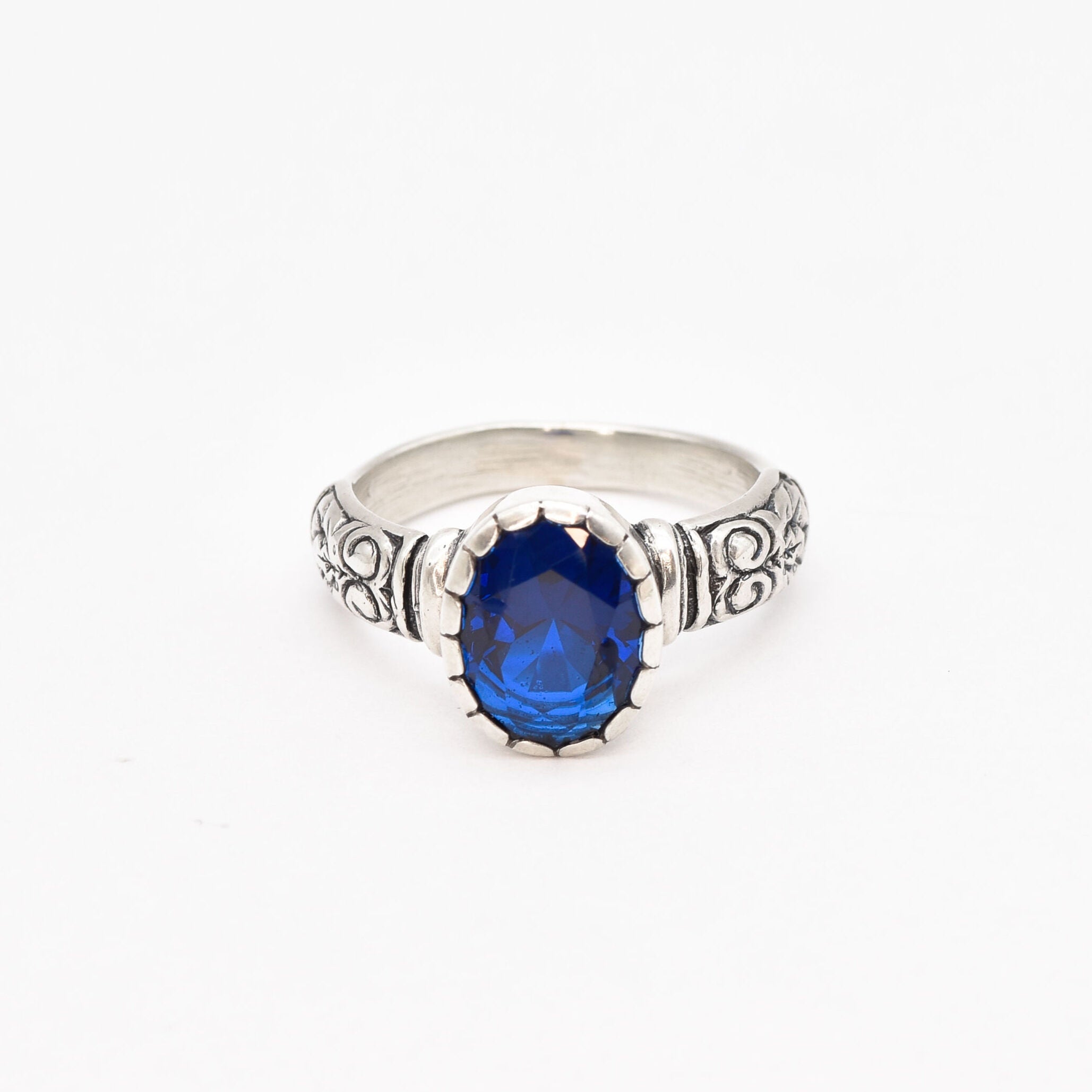 Sapphire Silver Ring set with Created Sapphire in a diamond cut & stunning blue color, at size 10x8mm (3 Cts).