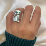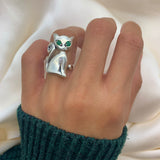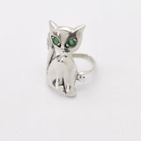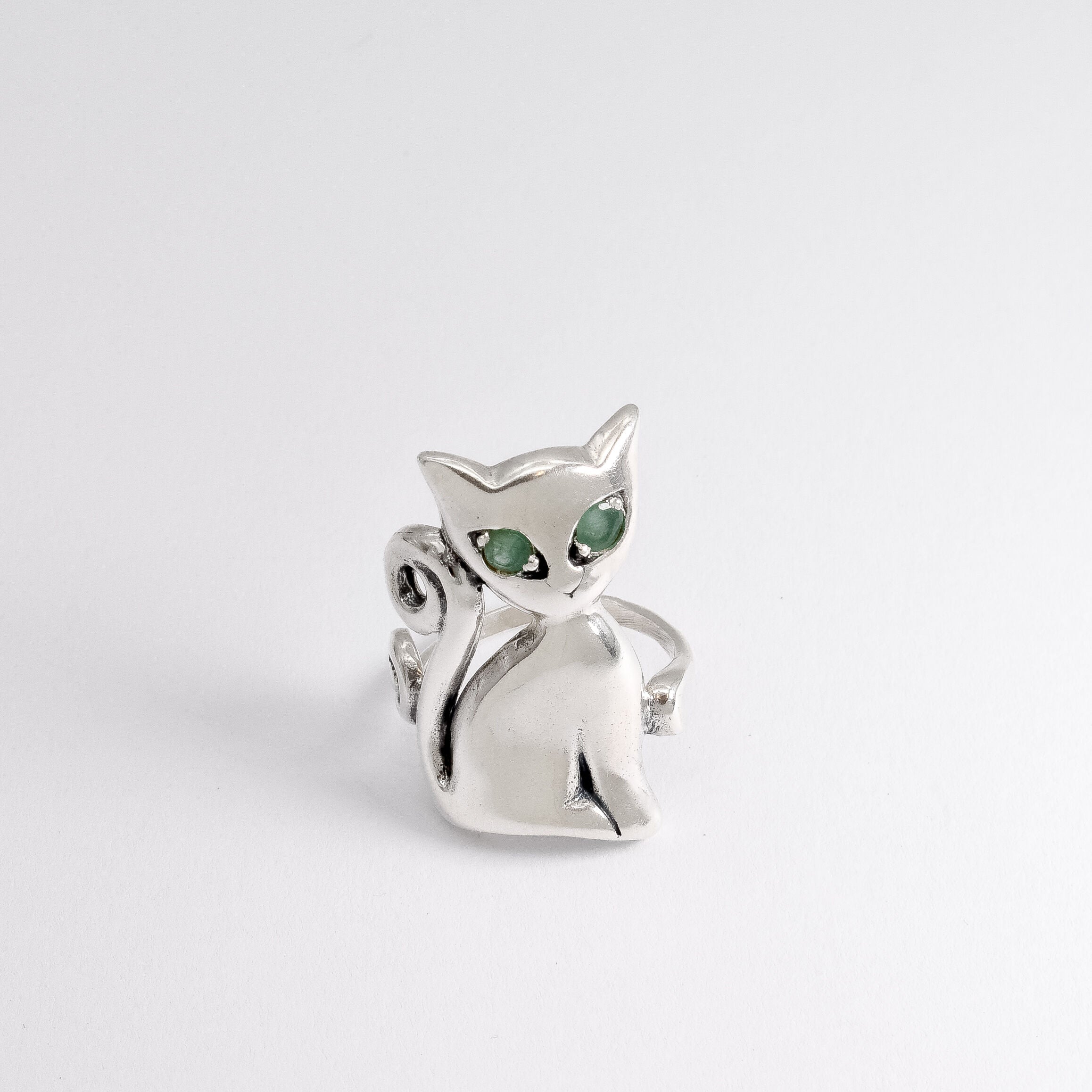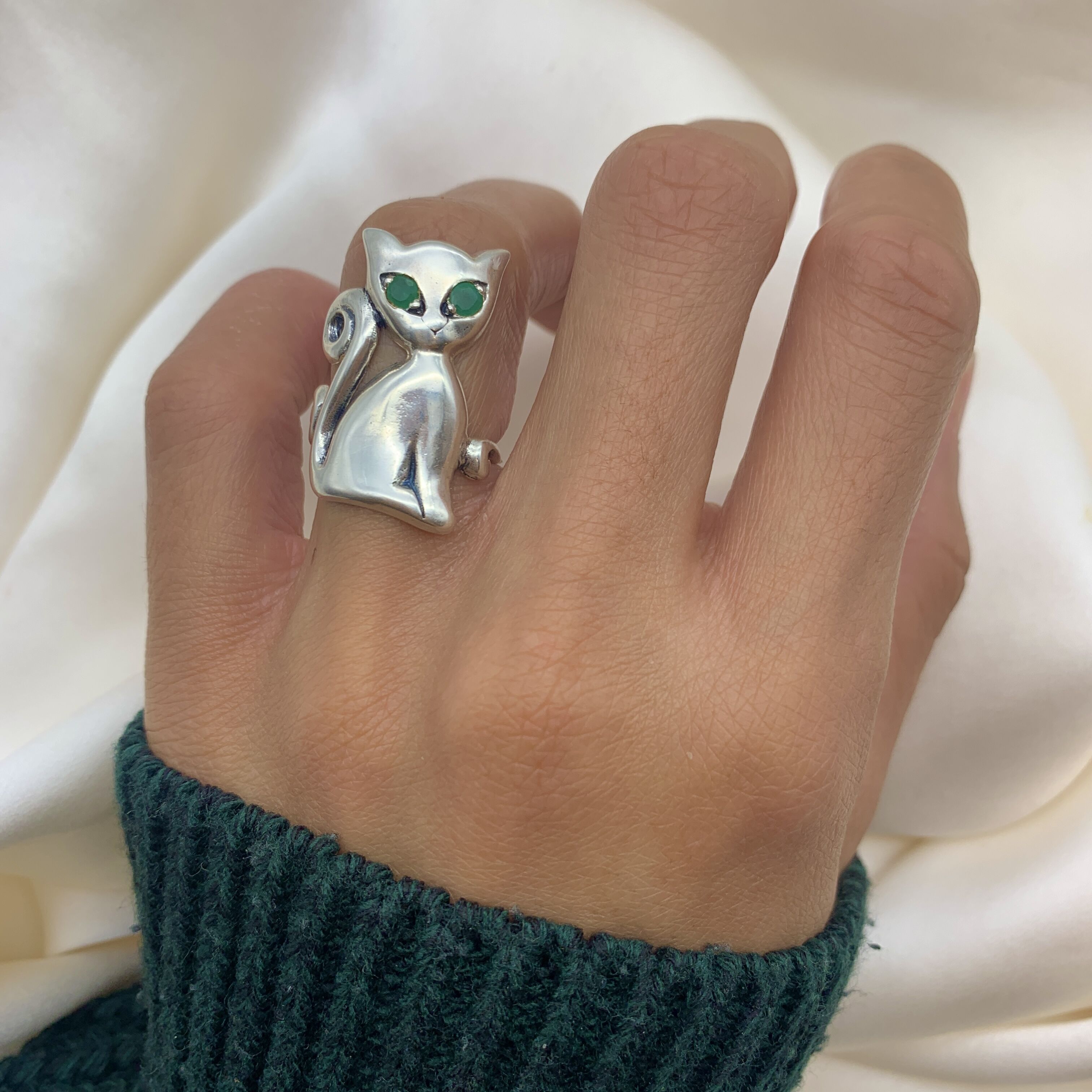 Silver Cat Ring - Natural Emerald Ring - Statement Cat Ring