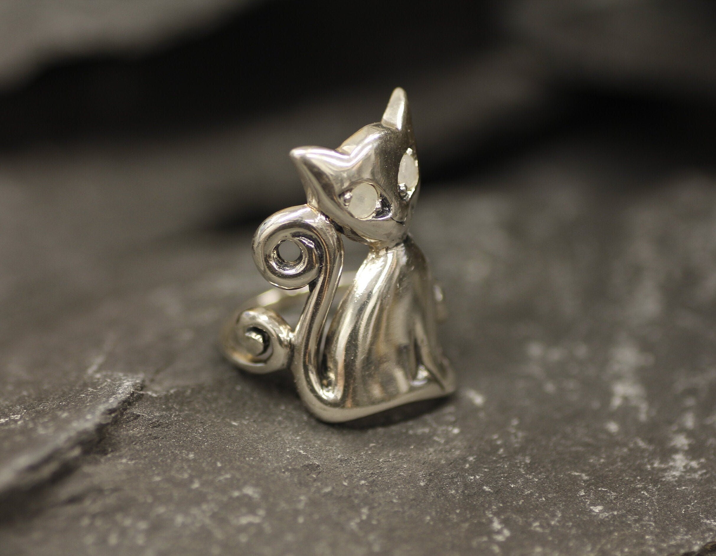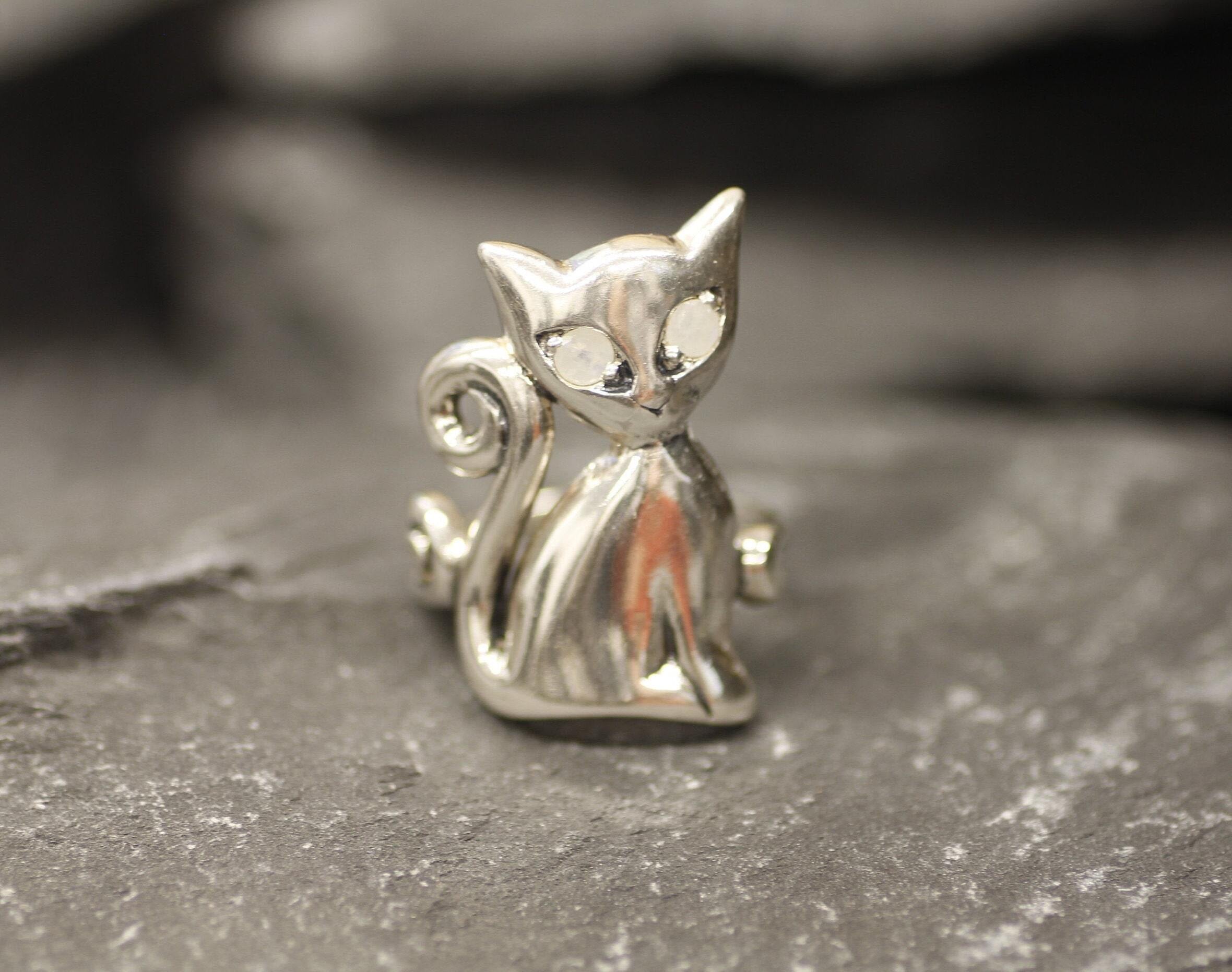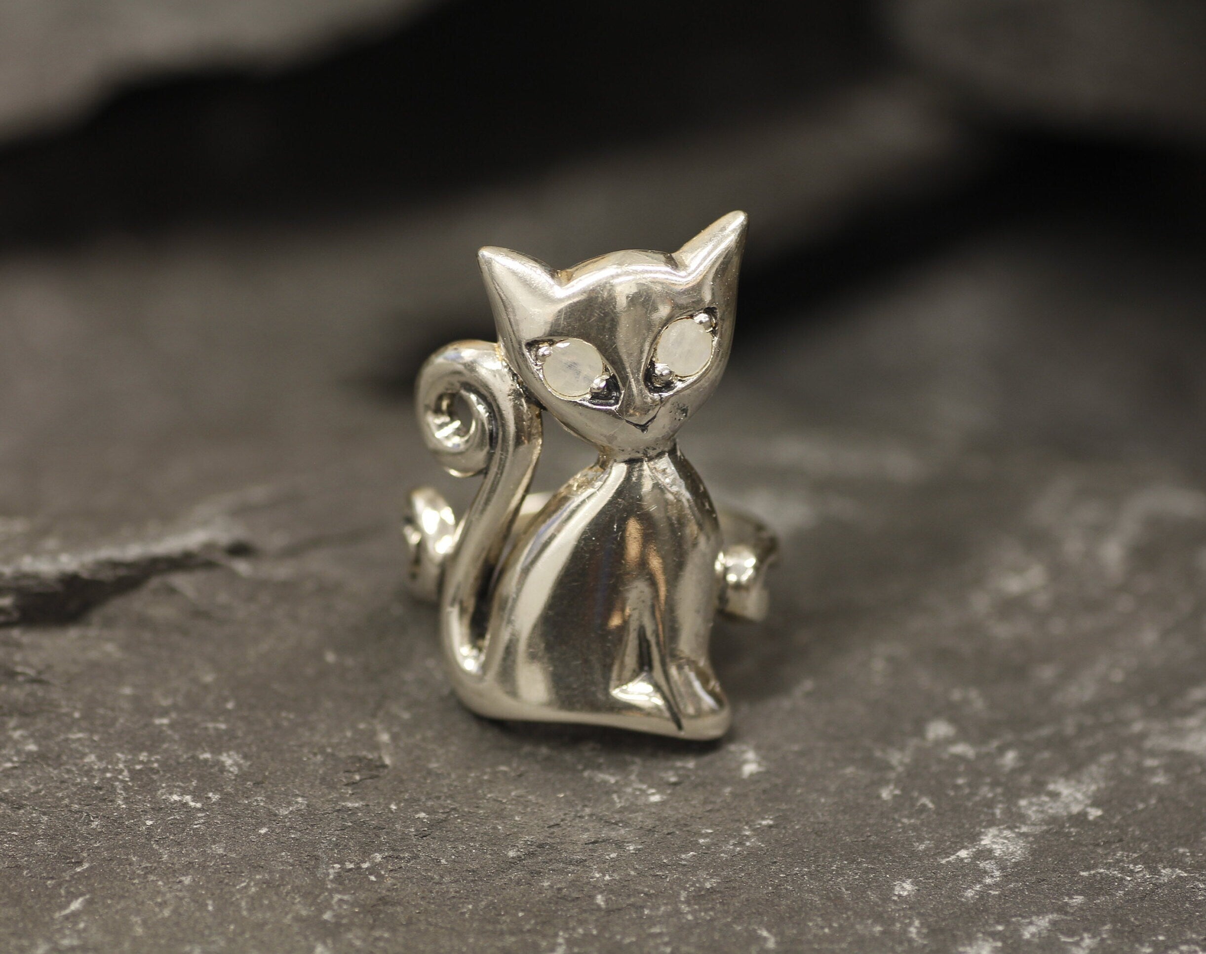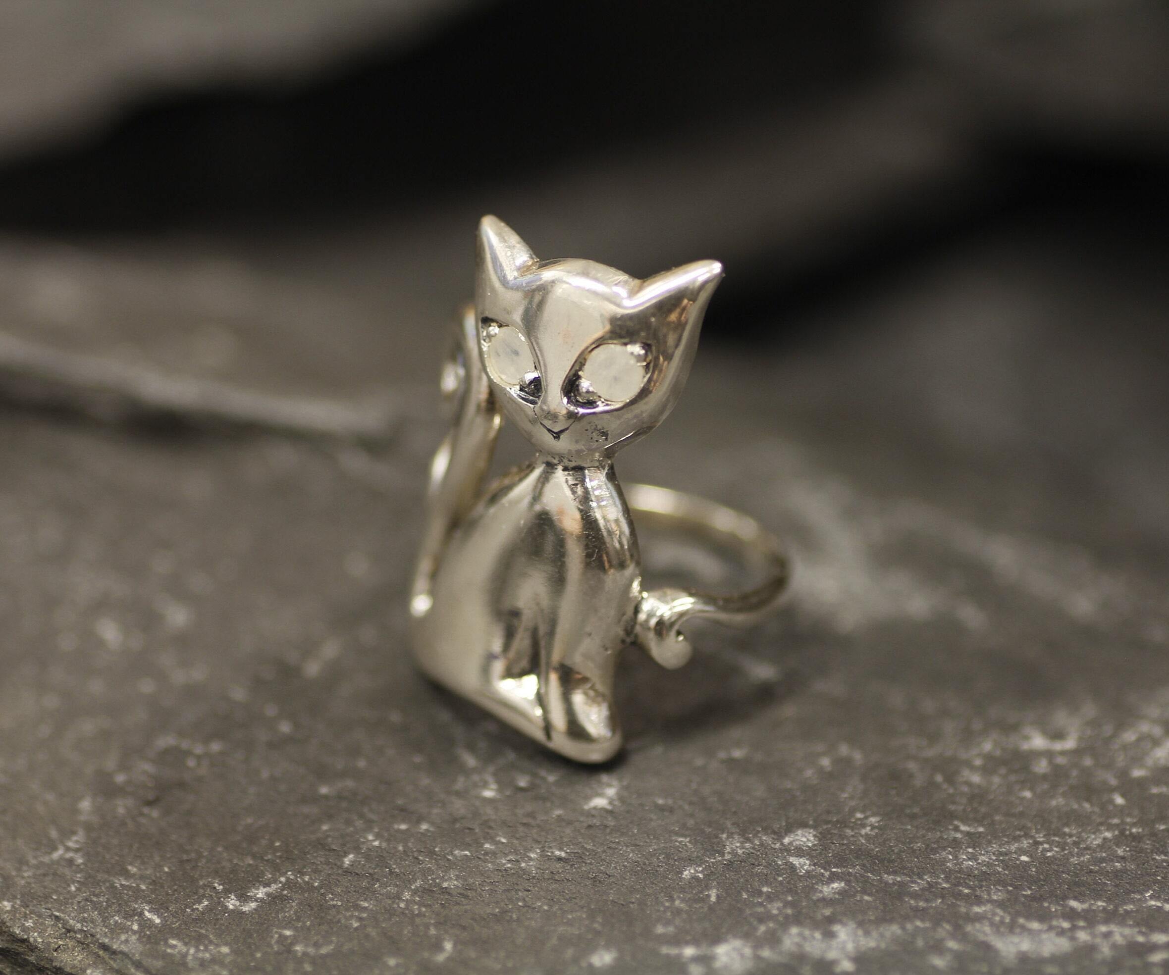 Silver Cat Ring, Natural Rainbow Moonstone, Long Cat Ring, June Birthstone, Kitten Ring, Statement Ring, Animal Ring, Sterling Silver Ring