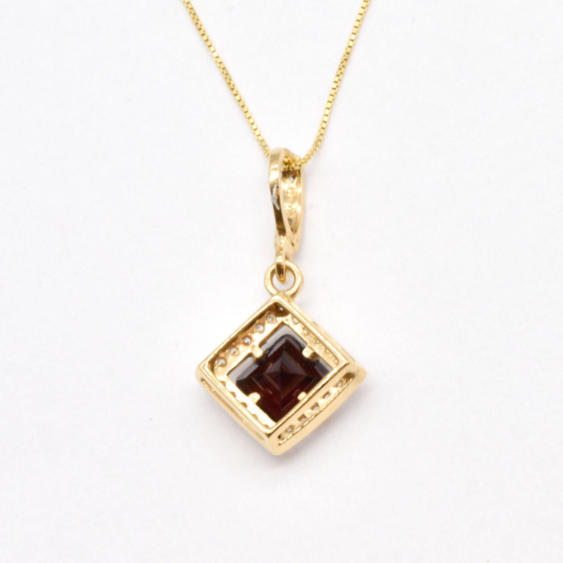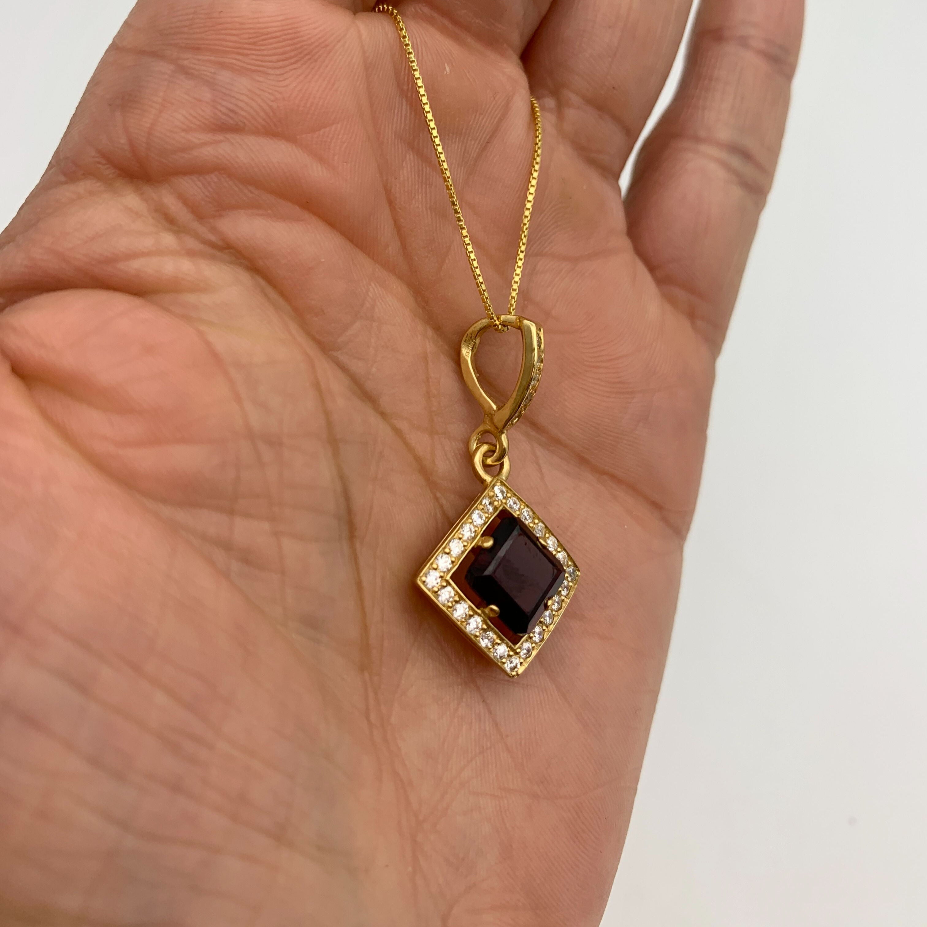 Gold Garnet Pendant set with a Natural Garnet in perfect diamond cut & deep red color, 10x10mm (6 Cts) from Mozambique with small CZ Diamonds.