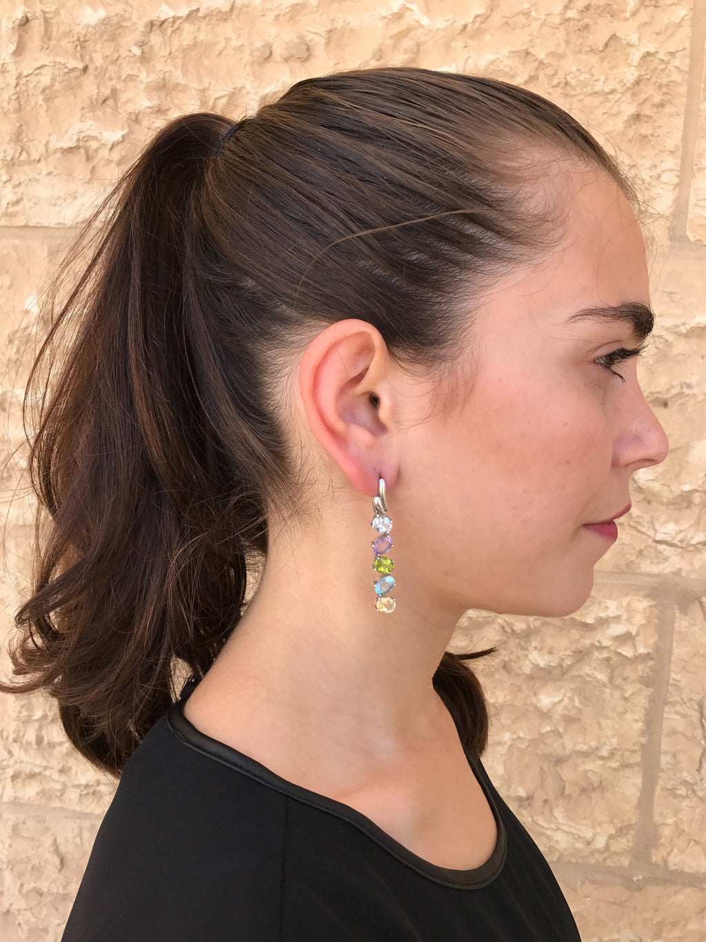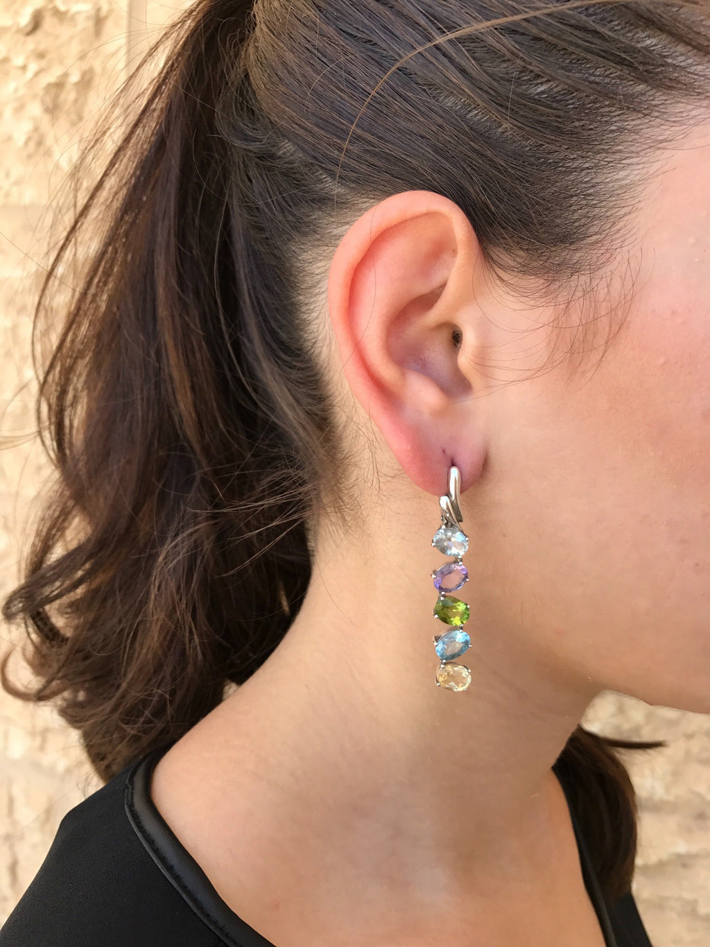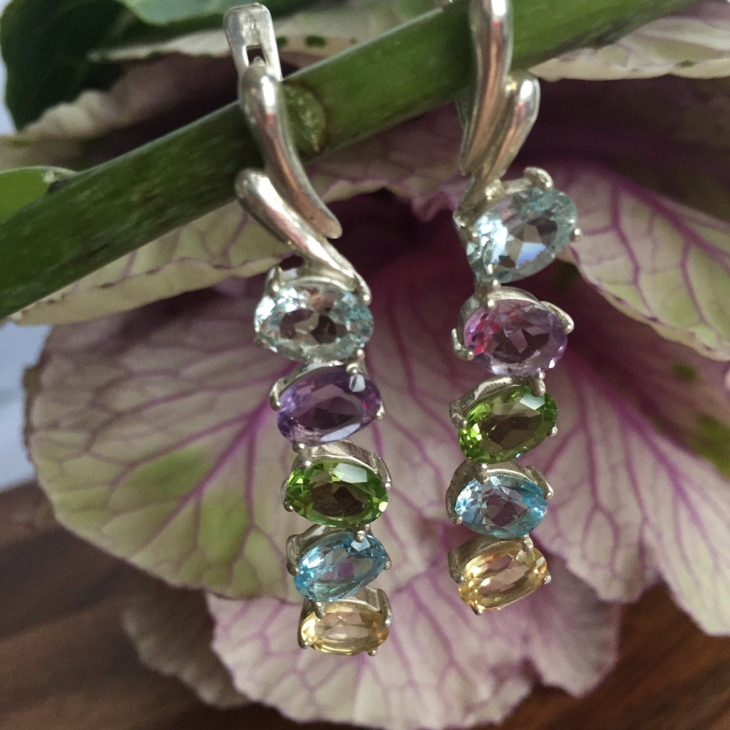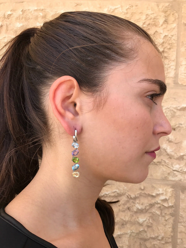 Vertical Gemstone Earrings set with Natural Citrine, Natural Amethyst, Natural Peridot & Natural Blue Topaz stones in a perfect Diamond cut and perfect clarity (10 Natural Stones altogether). Spontaneous shape design made of Solid 925 Sterling Silver (no “coating" ☞ only Solid Pure Silver - made to last). They can be worn as Bridal Earrings, Evening Earrings, Gala Events and pretty much for any special occasion.