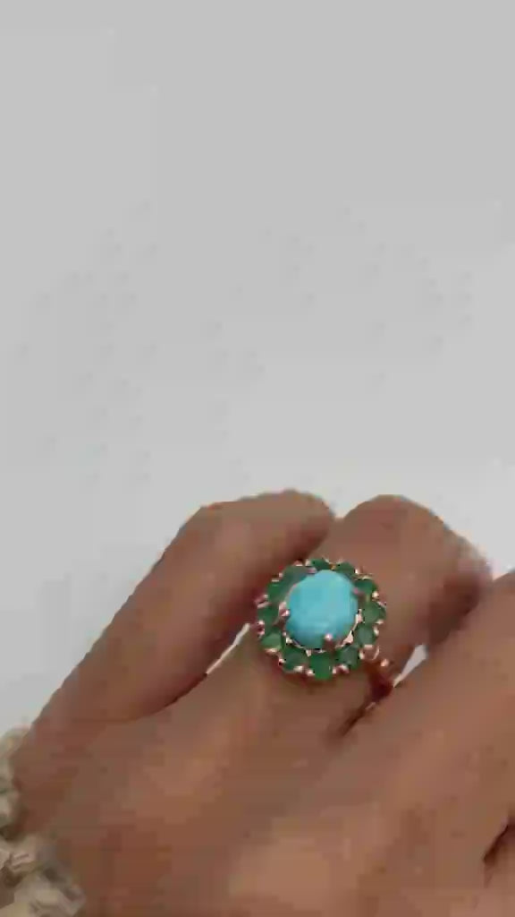Turquoise Flower Ring set with a Genuine Arizona Turquoise (Sleeping Beauty) in a top grade, at 10x8mm (3 Cts) surrounded by Natural Emeralds, at 3mm each (1.5 Ct all) from Colombia.